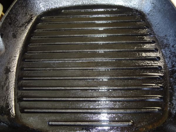 Я готовил на сковороде гриль, но вы можете использовать любую, желательно тяжелую с толстым дном. Смазываю слегка сковороду оливковым маслом.