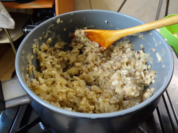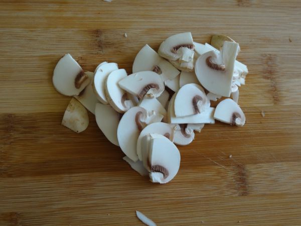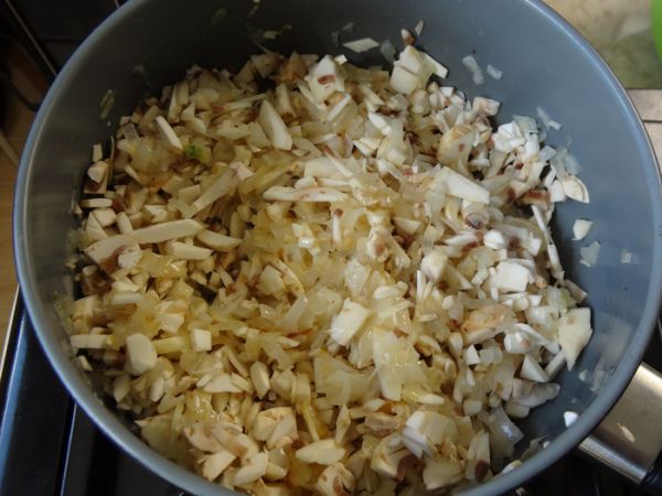 Нарезаем шампиньоны, можно ещё мельче, чем на фото. Закидываем их к луку, как только лук начал золотиться.