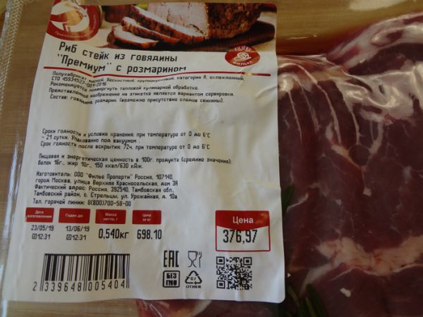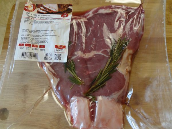 Увидал в Ашане мясо для стейков, называется - "Риб стейк премиум". 370 рублей за 540 грамм. Купил пожарить и проверить, как оно на вкус, не слишком ли жёстко.