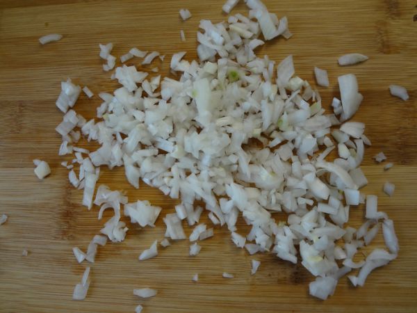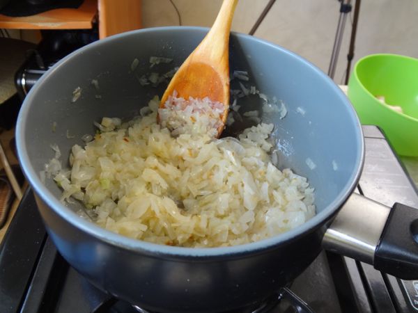 Мелко режем лук, выкладываем его в сотейник, и жарим на среднем огне, с оливковым маслом. Постоянно помешиваем.