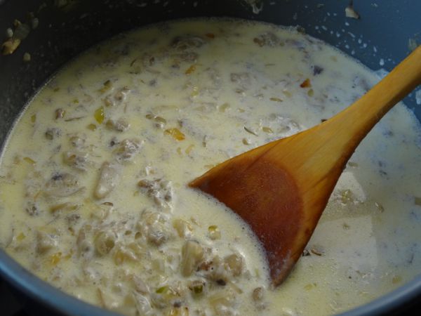 Как только шампиньоны будут готовы и съедобны на вкус, уменьшаем огонь до минимума, добавляем соль, перец, мускатный орех и сливки, помешиваем.. ВНИМАНИЕ - если сливки 10% то добавляем 2 чайные ложки муки, там мы поможем их загустить. Если сливки у вас 20-30% то мука вам и не нужна. Кстати, если соус получается слишком густым - можно добавить немного воды, до нужной консистенции.