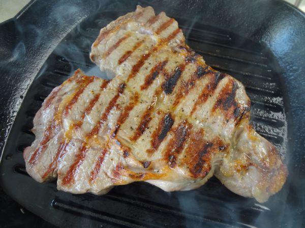 Через 3 минуты смазываю мясо ещё оливковым маслом, соль, перец и переворачиваю его на другую сторону.