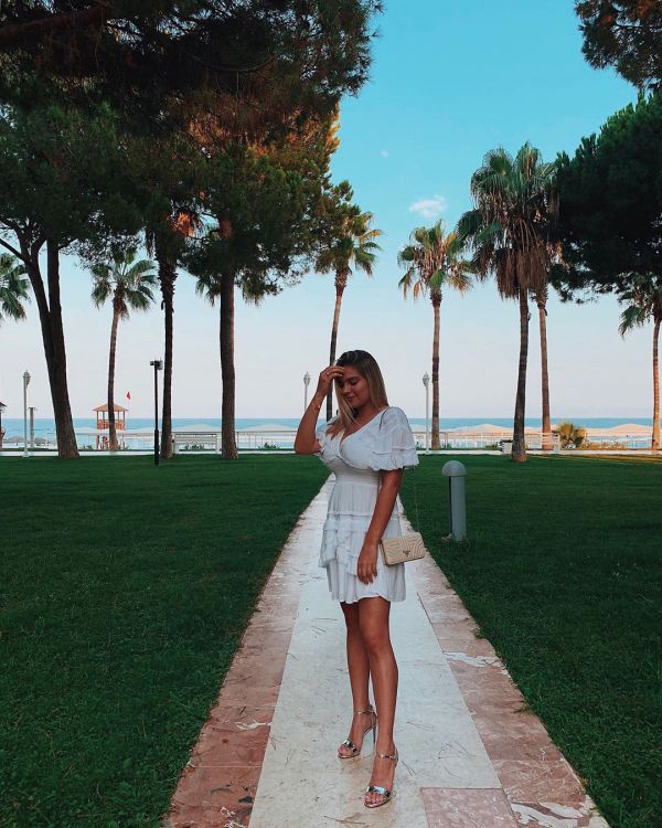 Сейчас Екатерина отдыхает в Турции. Девушка показала поклонникам фото в белом кружевном платье с оборками, которое подчеркнуло ее загорелую кожу. Внучка артиста дополнила образ маленькой сумочкой на цепочке и босоножками на шпильке.