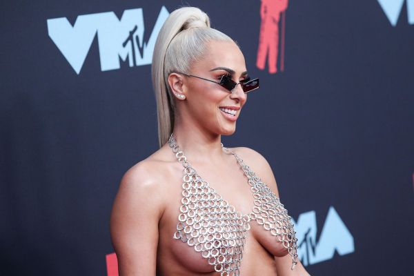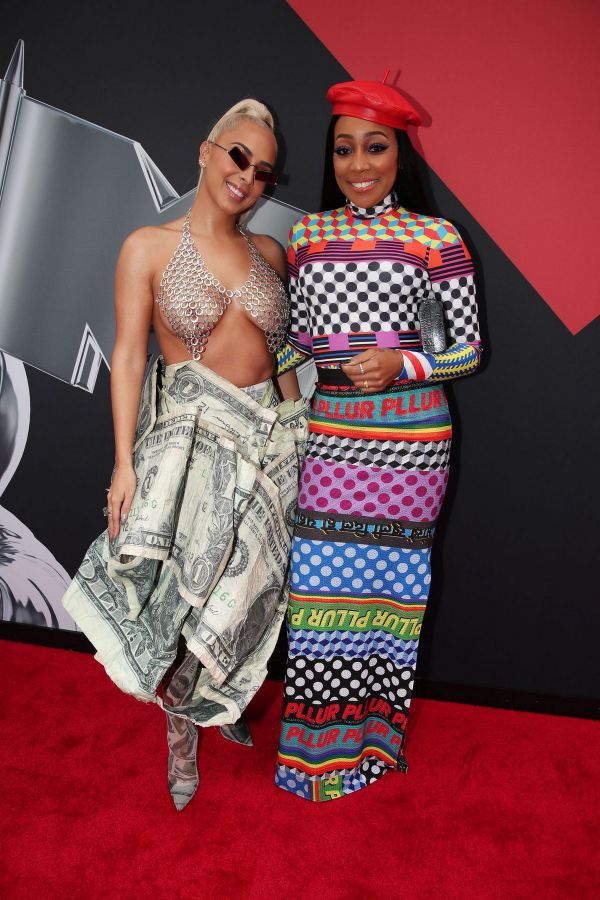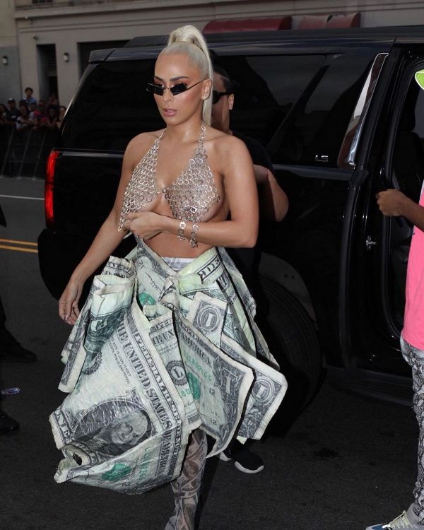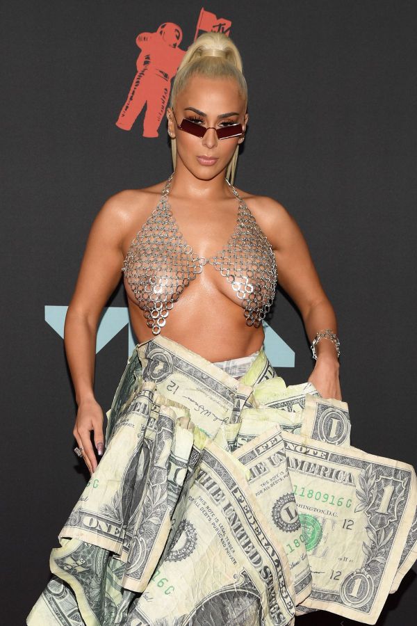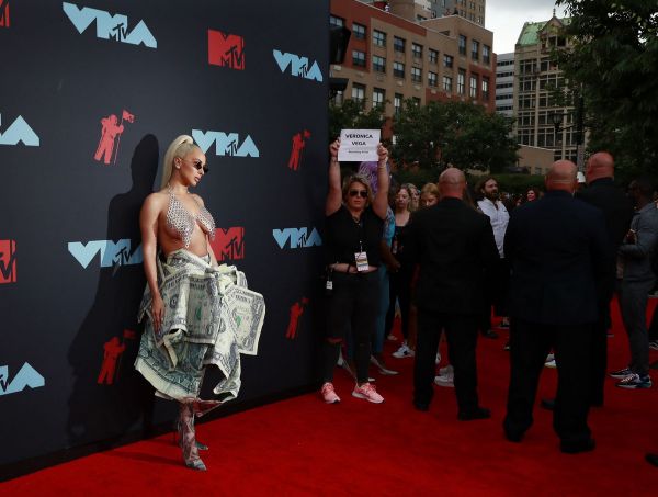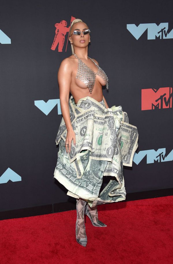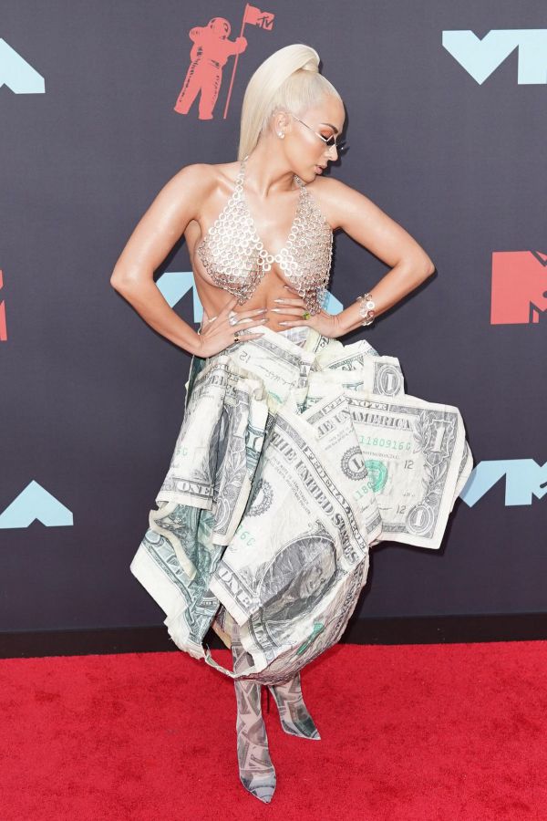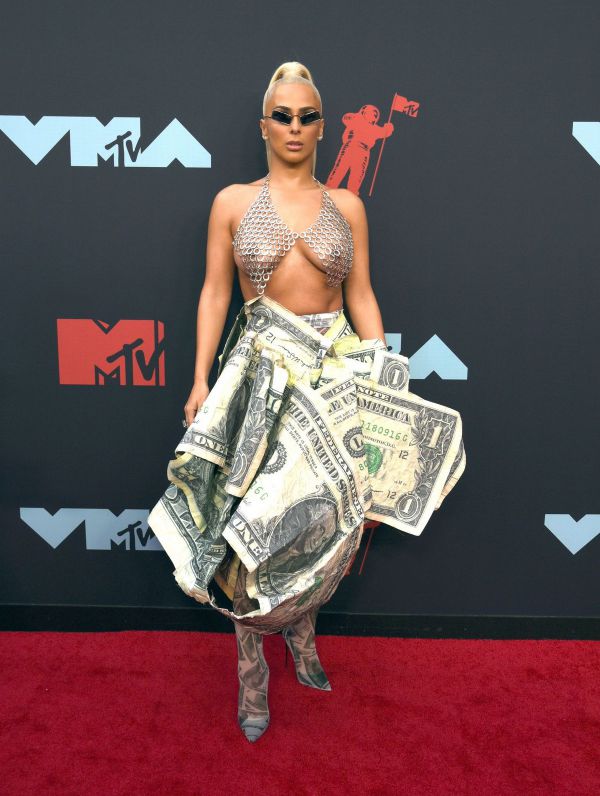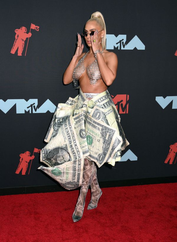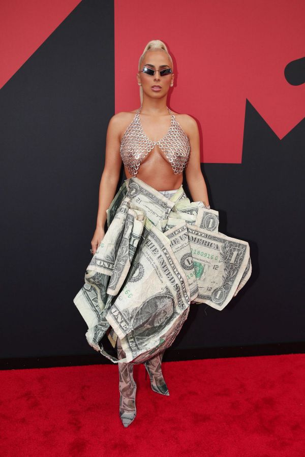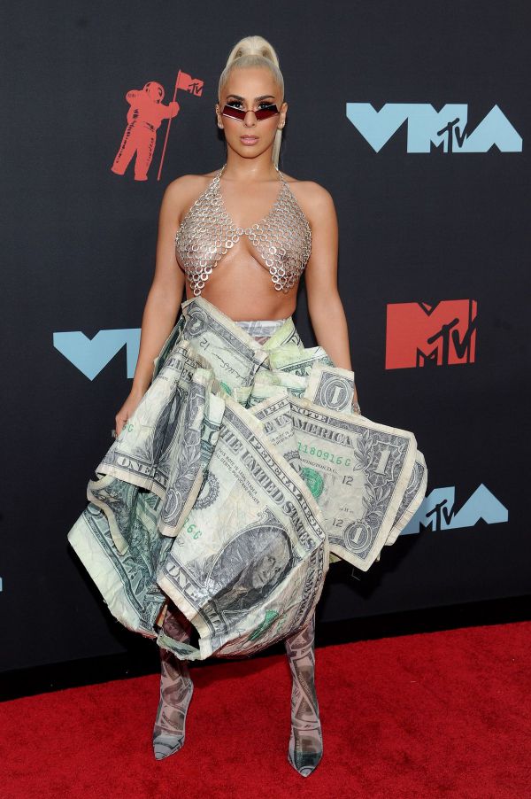 28-летняя певица Вероника Вега (Veronica Vega) надела объемную юбку с принтом долларовой купюры, которую дополнила колготами в тон и прозрачным топом с цепями, на MTV Video Music Awards 2019 в Ньюарке, штат Нью-Джерси.