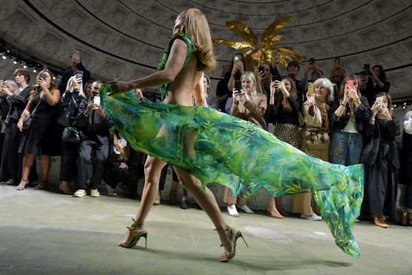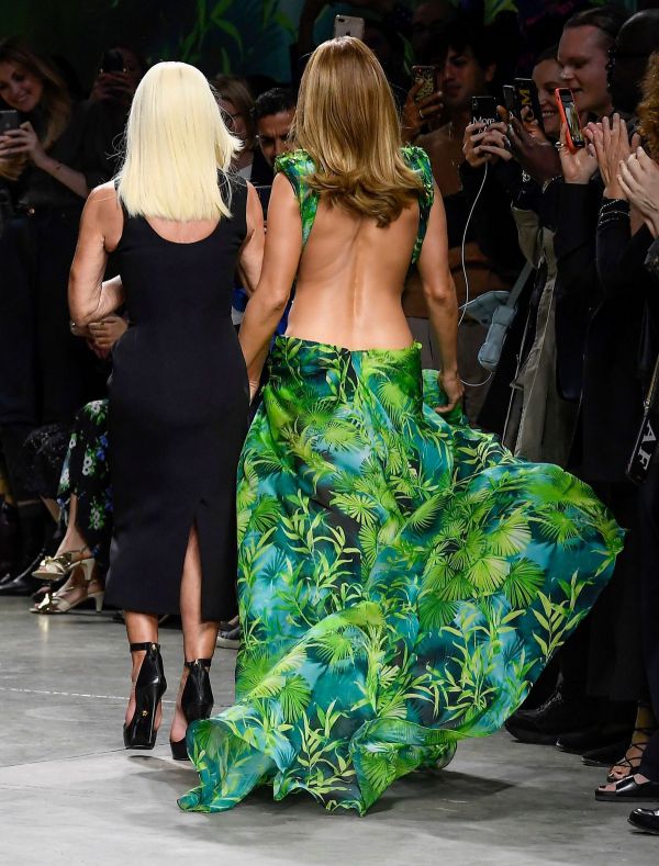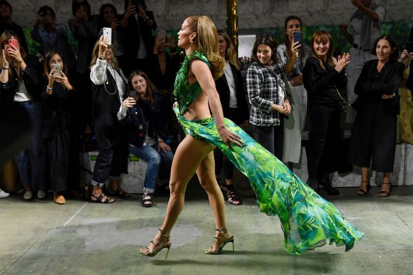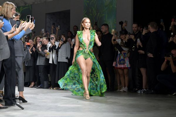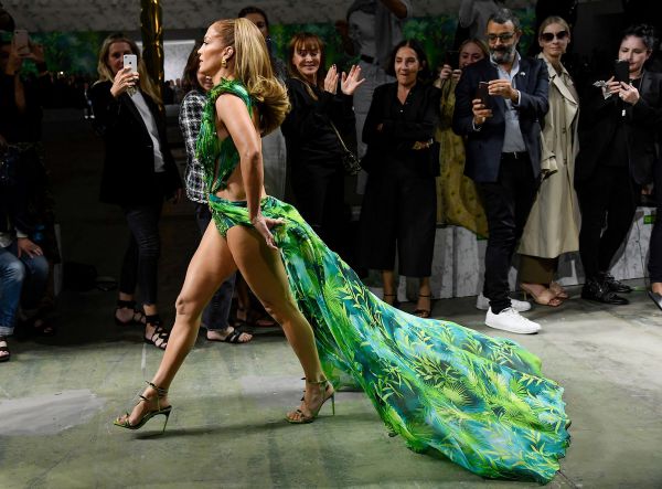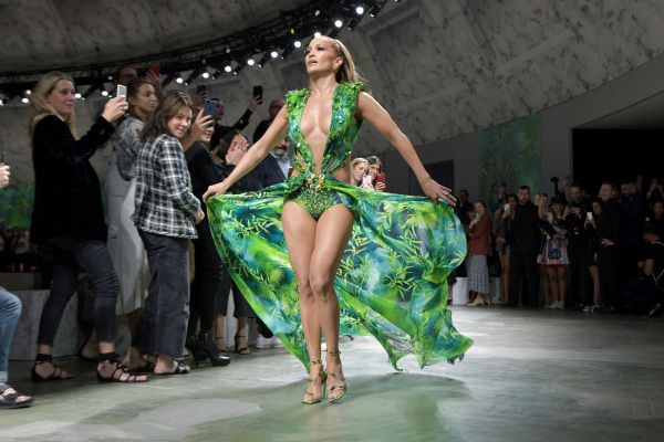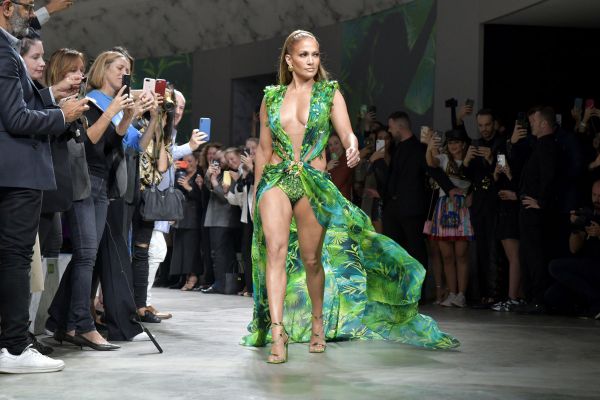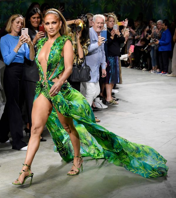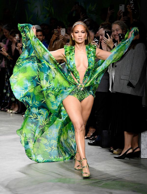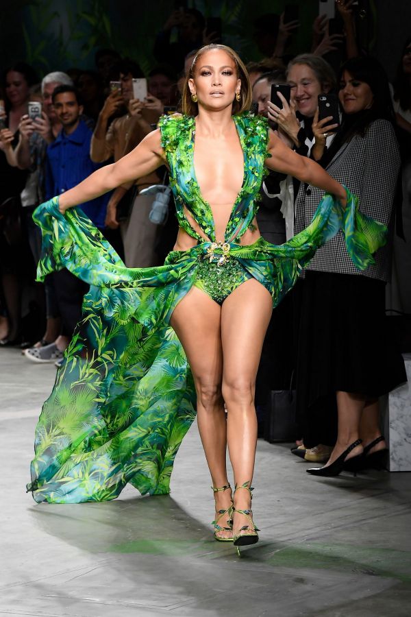 50-летняя американская актриса, певица, танцовщица, модельер, продюсер и бизнесвумен Дженнифер Лопес (Jennifer Lopez) в сексуальном платье позирует на подиуме во время нового шоу Versace Spring / Summer 2020 на Неделе моды в Милане, Италия.