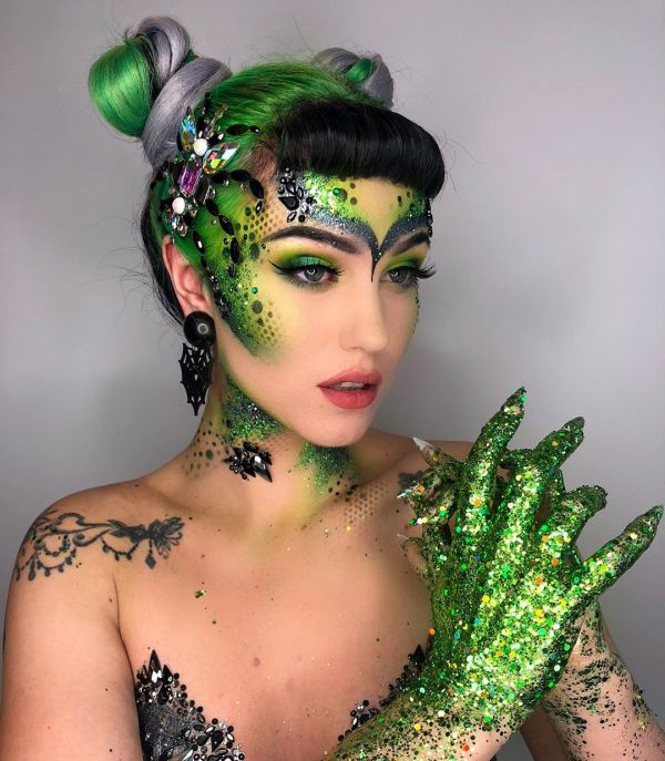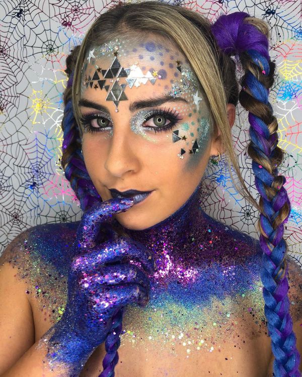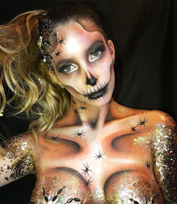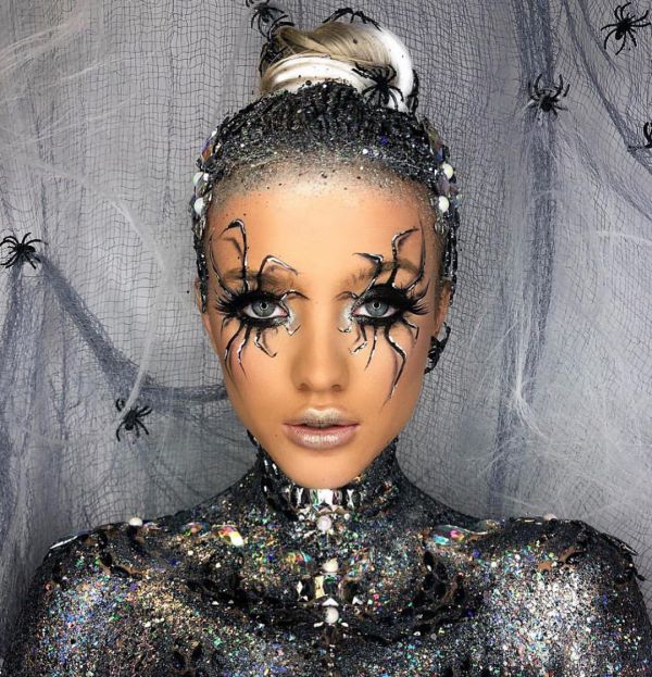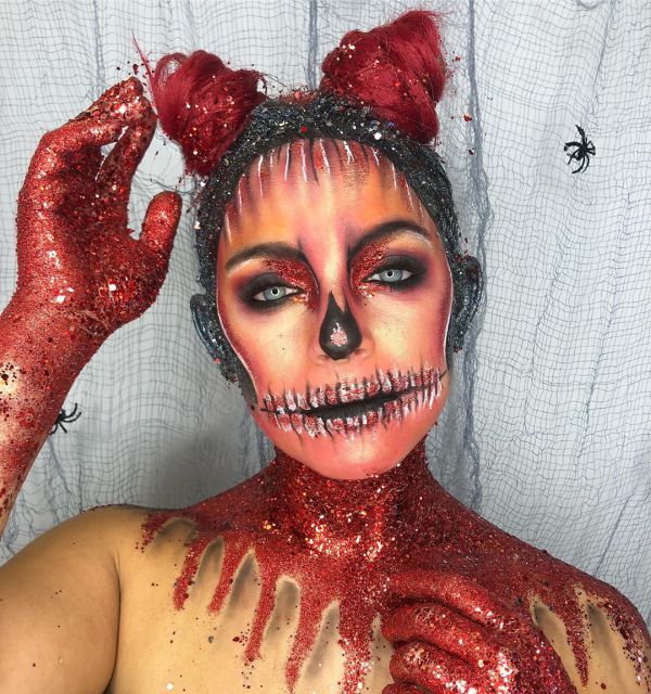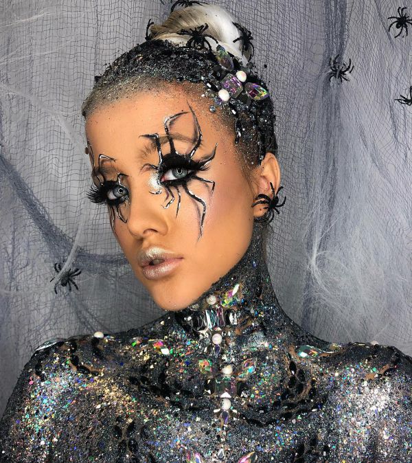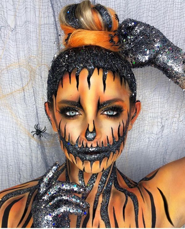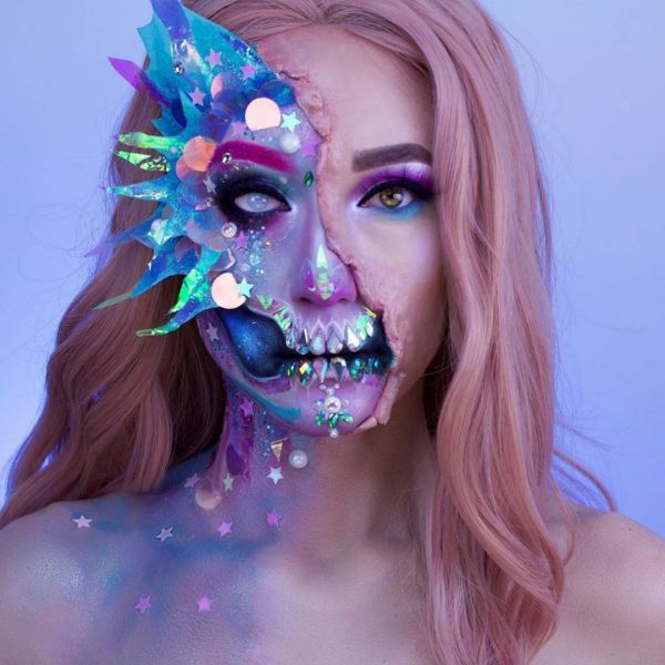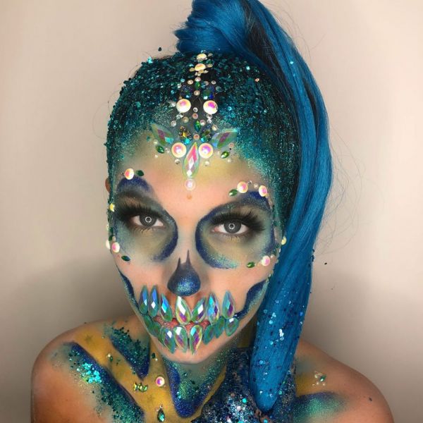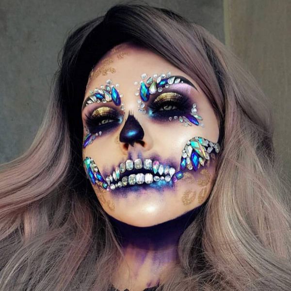 С приближением Хэллоуина появляется все больше идей, как оригинально украсить свое тело к этому празднику. На страничке Go Get Glitter в Instagram много интересных идей оригинального макияжа. Хоть блестки и стразы не очень практичны в использовании, выгладит такой макияж очень эффектно.