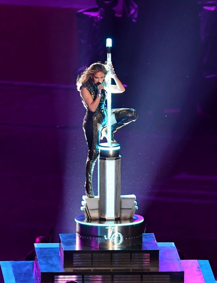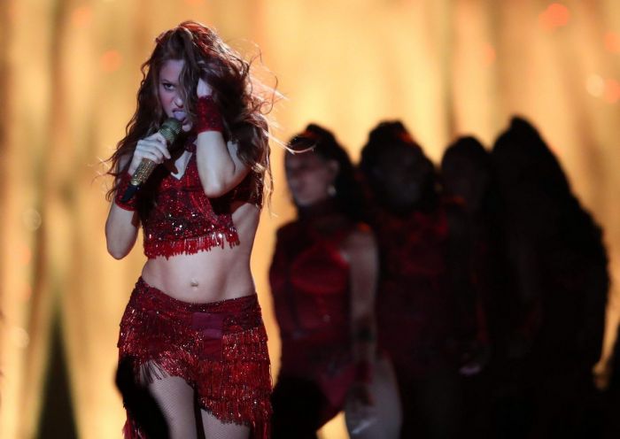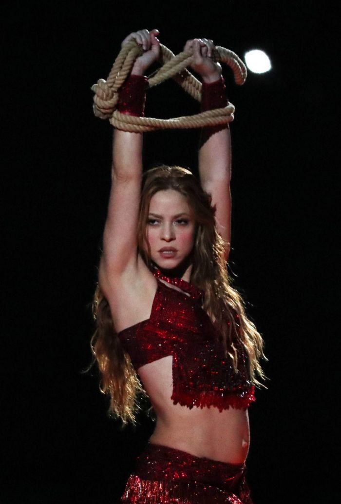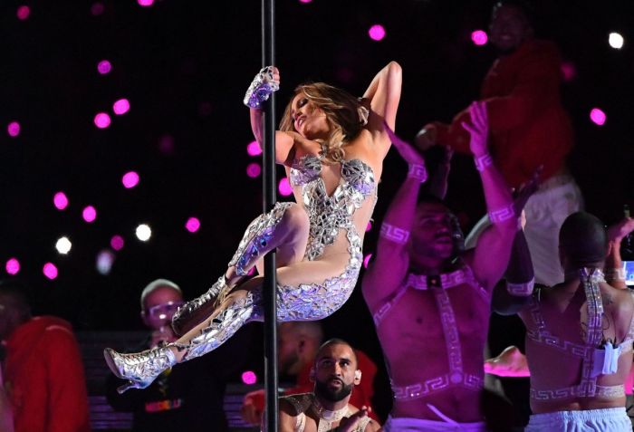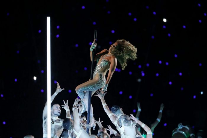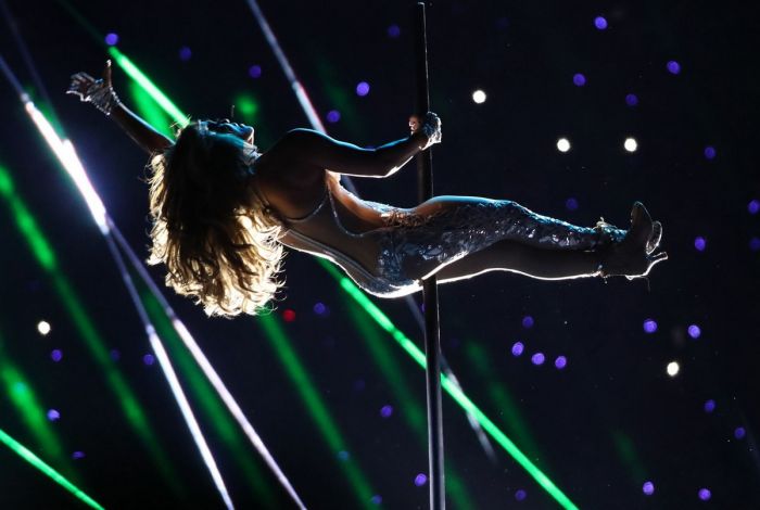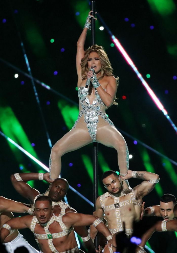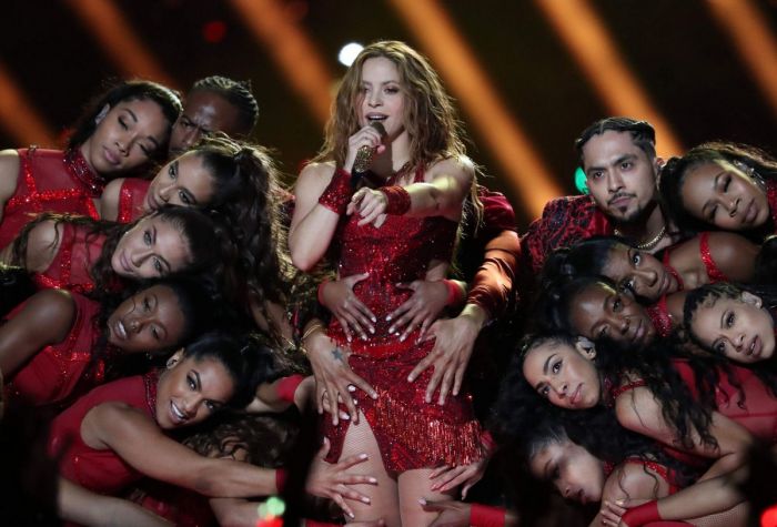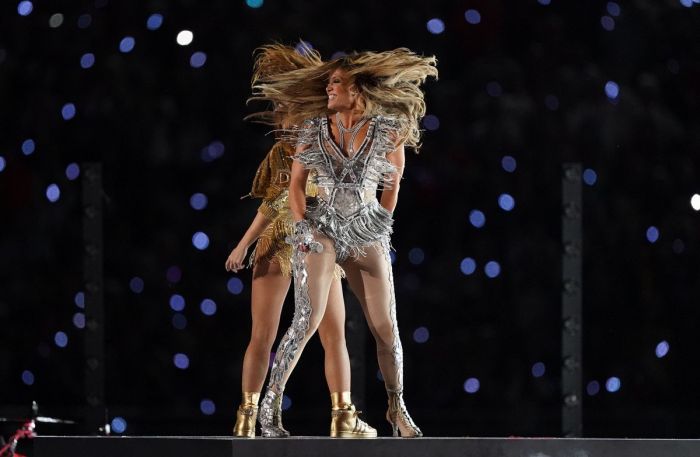 50-летняя американская актриса, певица, танцовщица, модельер, продюсер, бизнес-вумен Дженнифер Лопес (Jennifer Lopez) и 43-летняя колумбийская певица, автор песен, танцовщица, музыкальный продюсер, хореограф и модель Шакира (Shakira) на шоу Pepsi Super Bowl LIV в Майами.