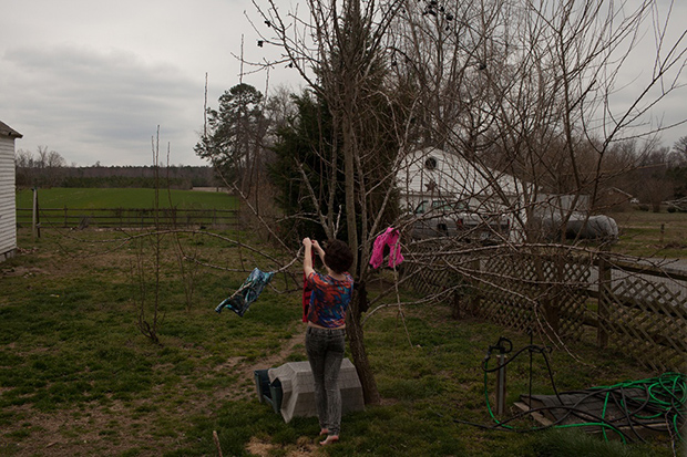 Постирав вещи для стриптиза, Иден развешивает их сушиться на дереве на заднем дворе дома матери в Ланкастере.