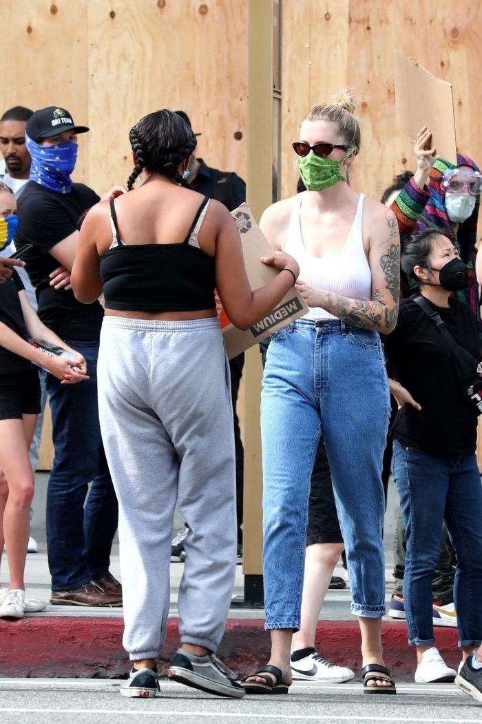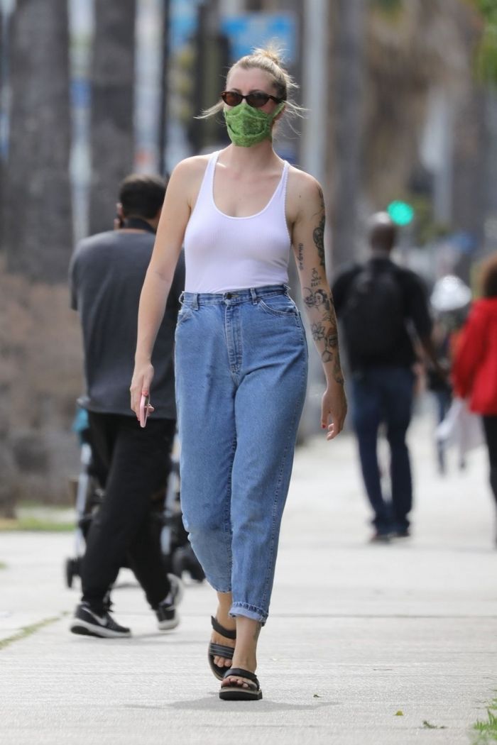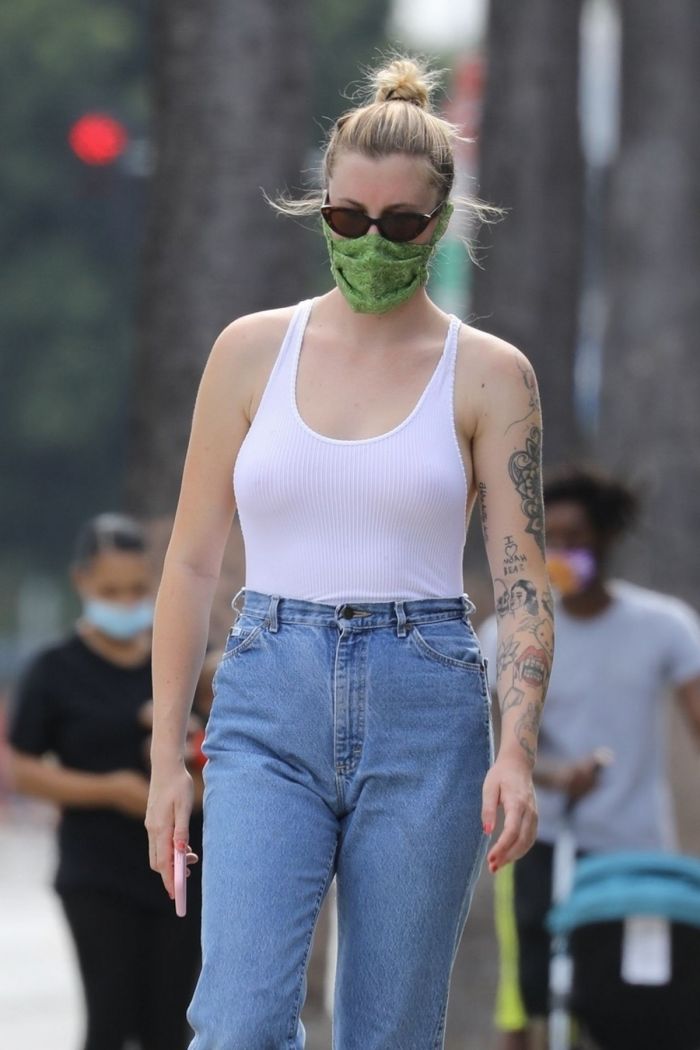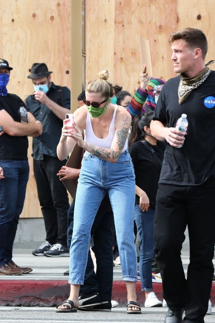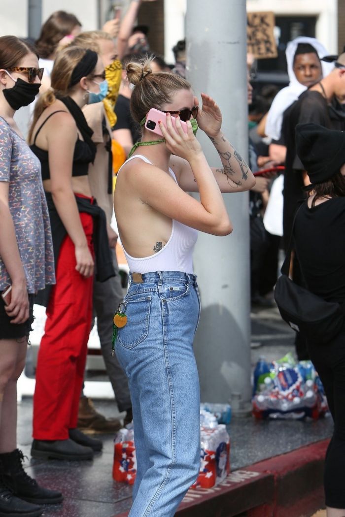 24-летняя американская модель и актриса, кинопродюсер, диджей, дочь Ким Бейсингер и Алека Болдуина, Айрленд Болдуин (Ireland Baldwin) в белой маечке без бюстгальтера была сфотографирована улице в Голливуде. Девушка приняла участие в протестной акции.