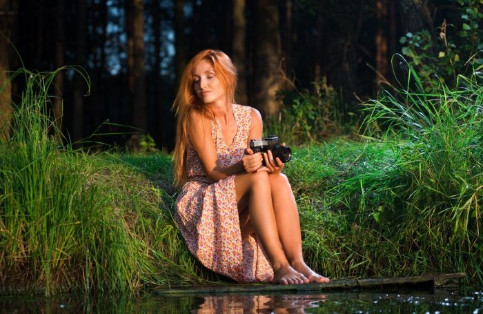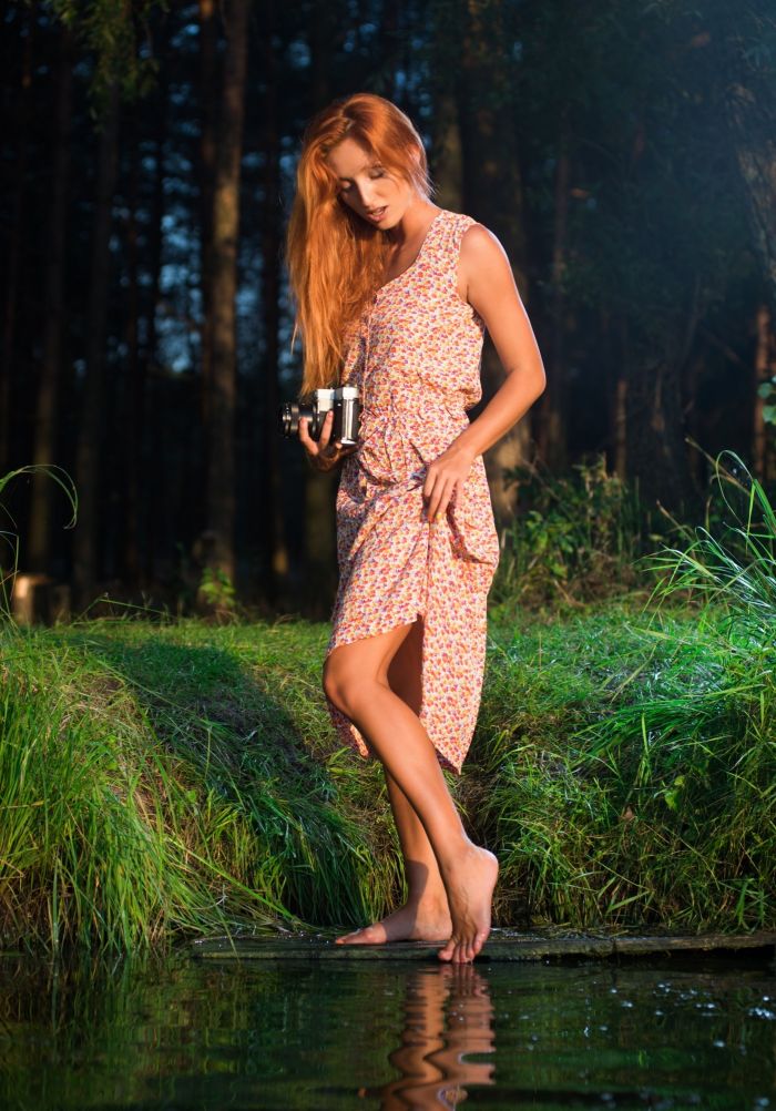Девушка занимается фотографией. Она отправилась в лес, чтобы сделать красивые снимки природы. В лесу было очень влажно и когда девушка подошла к реке, ей захотелось освежиться. Наша героиня задрала платье и спустилась к воде. Рыженька красотка, протерла грудь прохладной водой. Так как ни кого рядом не было девушка решила полностью раздеться, она сняла платье и трусики.