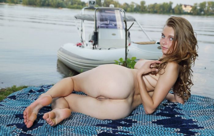 Парень с любимой девушкой арендовали лодку, чтоб добраться до другого берега реки, где практически не бывает людей. А вся это нужно для того, чтоб для любимой устроить эротическую фотосессию, о которой она так давно мечтала. Как только была постелена подстилка, наша героиня встав на нее ногами, стала позировать на камеру. Снимает полосатую майку, а потом и трусики. Зажигает полностью голой, показывая шикарные большие груди. Затем бритый лобок и девственную попку...