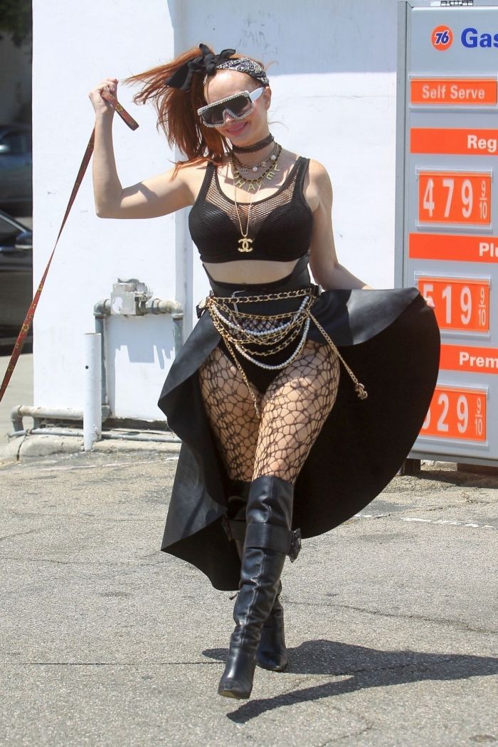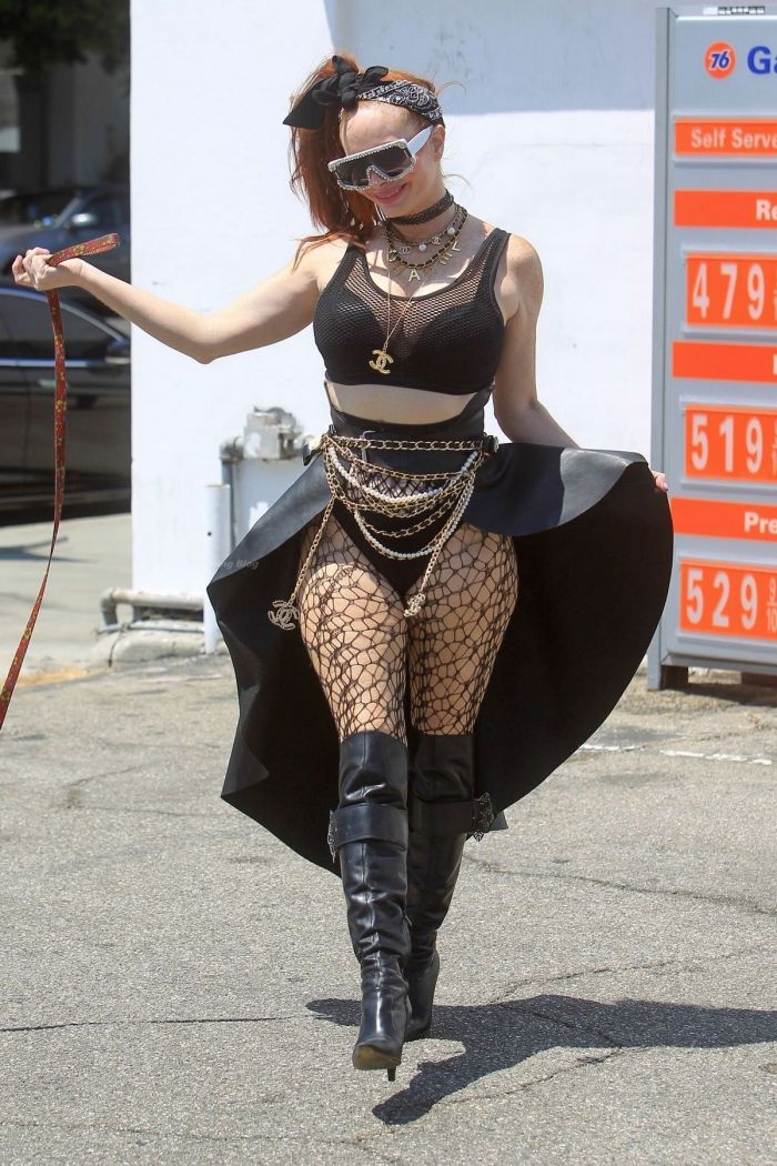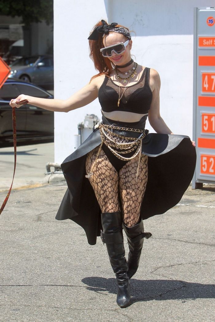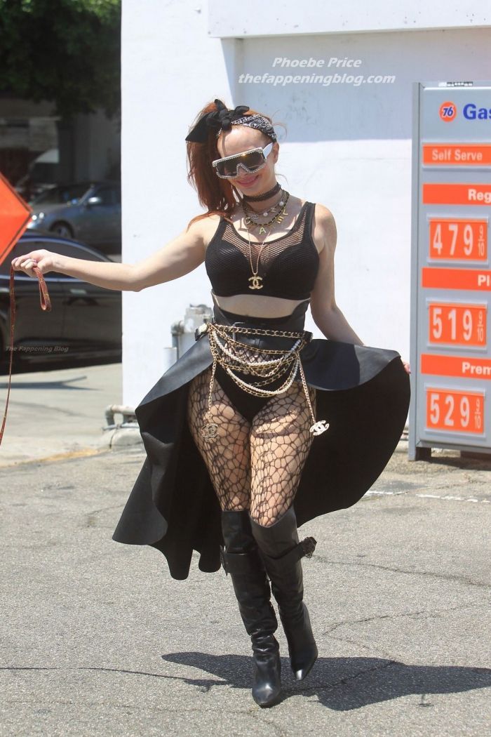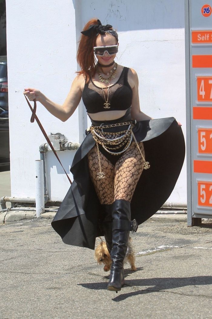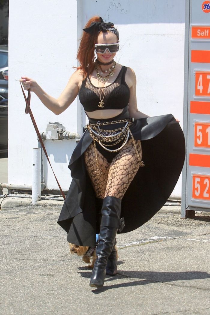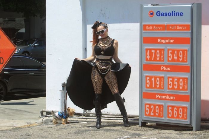 48-летняя американская актриса Фиби Прайс (Phoebe Price) в экстравагантном наряде на заправке в Голливуде.