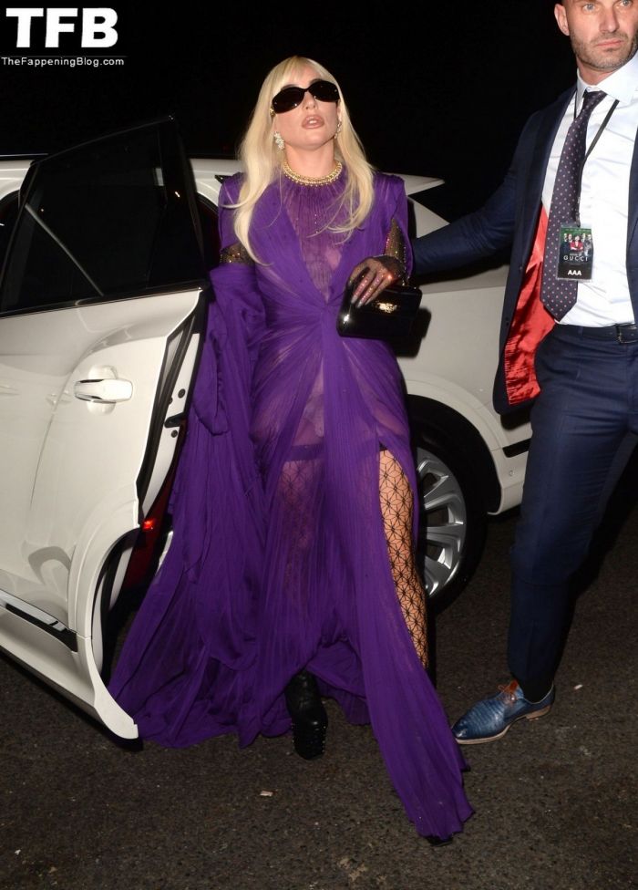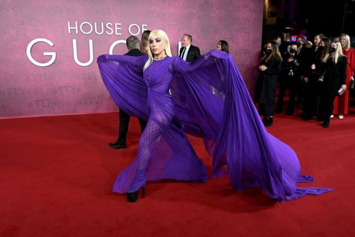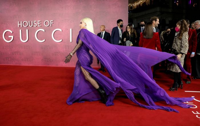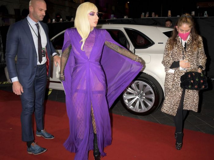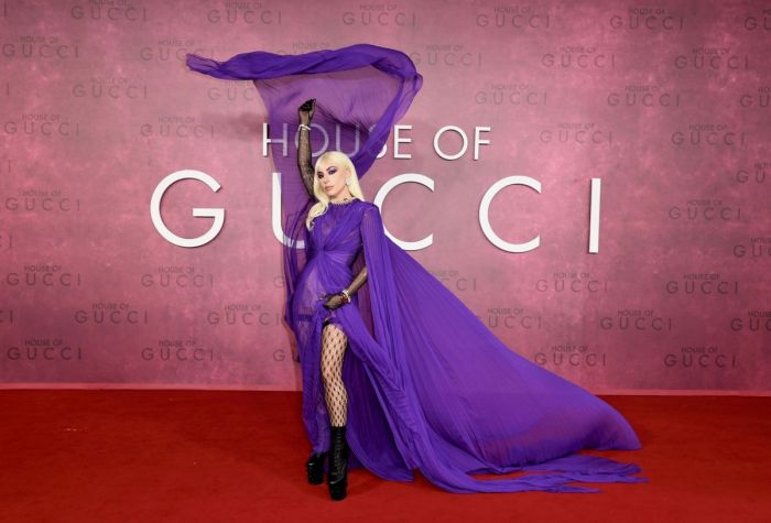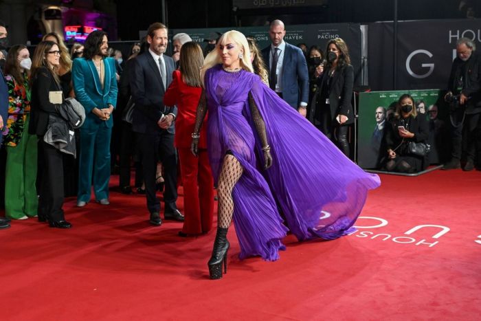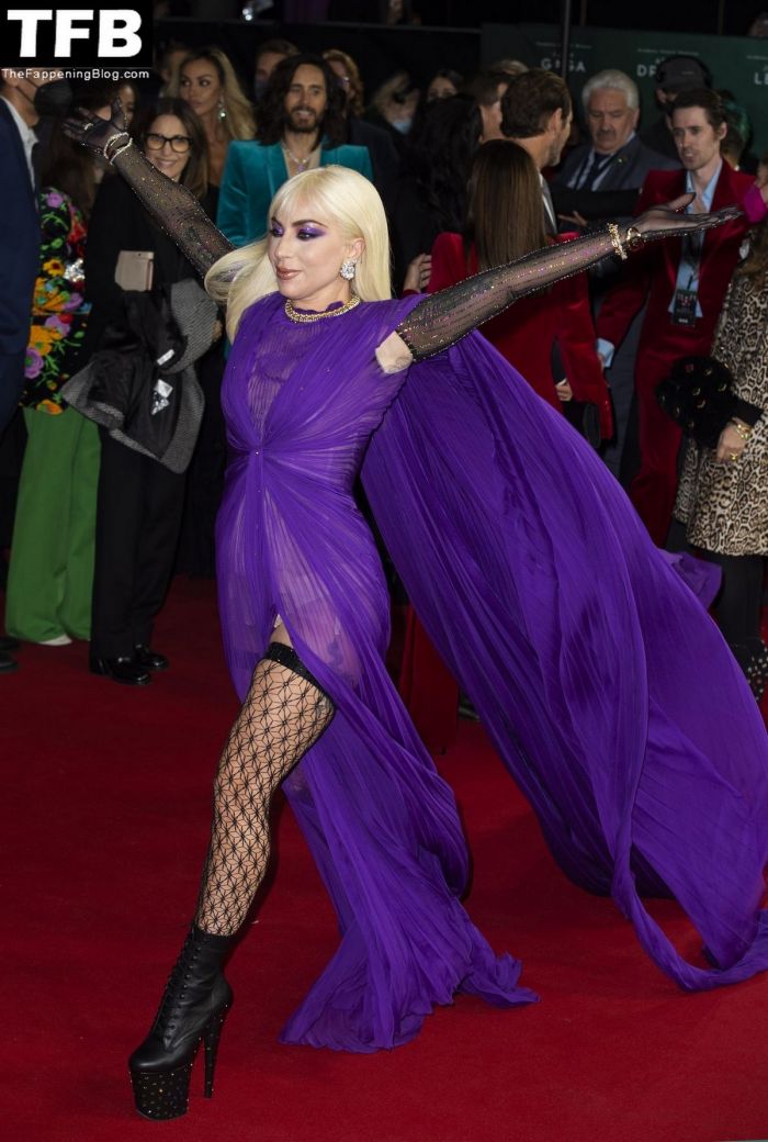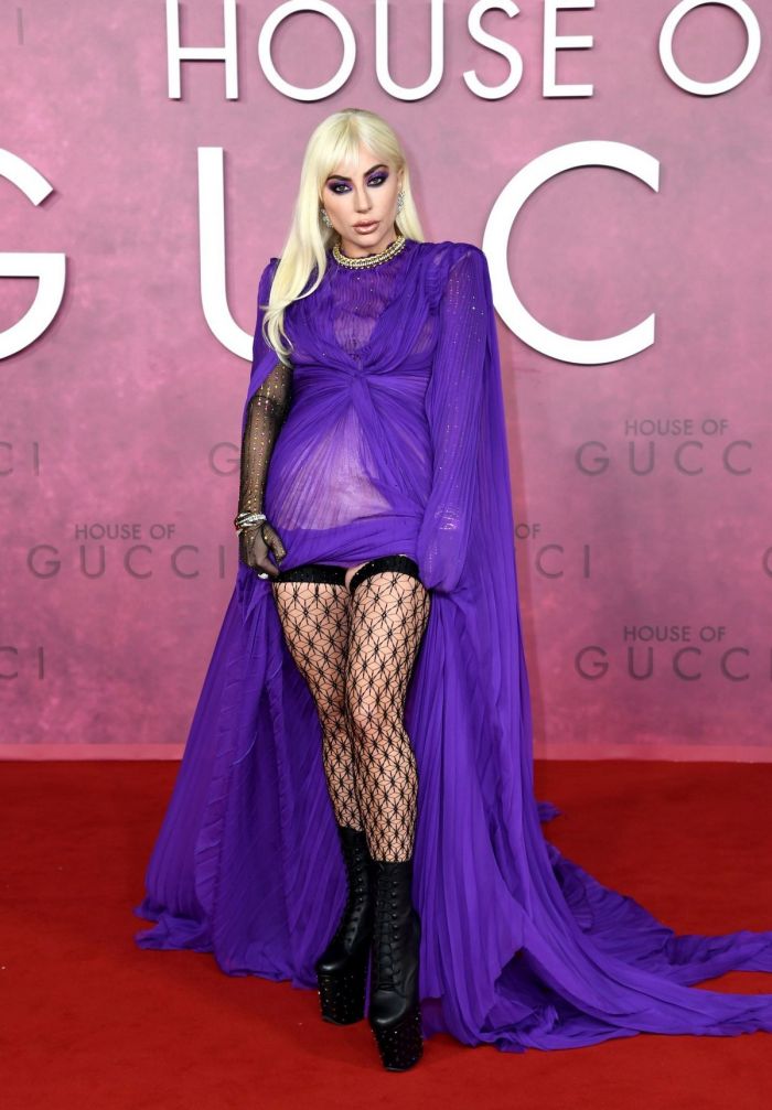 35-летняя американская певица, автор песен, продюсер, филантроп, дизайнер и актриса Леди Гага (Lady Gaga) в сексуальном платье позирует на красной дорожке для премьеры "Дома Гуччи" в Лондоне, Великобритания.