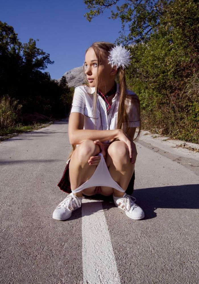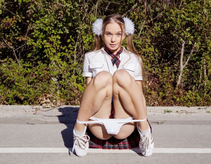 Высоко задрав перед камерой свою короткую юбку и медленно стянув свои белые трусики, молодая красотка с выставленной на показ голой попкой вовсю демонстрирует нам свои прелести.