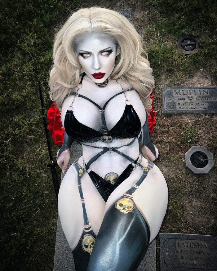 В честь жуткого праздника Мартин решила пройтись по кладбищу в костюме Леди Смерти, персонажа Marvel, известного своей серо-белой кожей и пикантными черными бикини-стрингами и накидкой. Она даже надела латексные чулки и раскрасила свое тело, чтобы имитировать украшенные черепами бретельки-спагетти богини. “Оцените образ моей леди Смерти на 1-100”, - предложила она в подписи к посту.