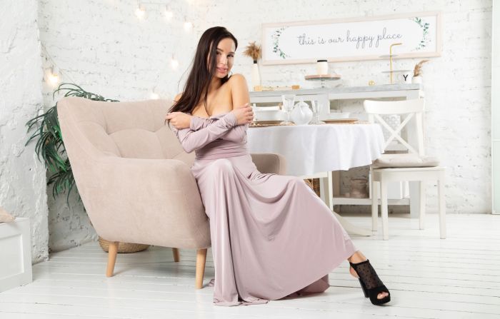 Медленно избавившись от шикарного длинного платья с трусиками, похотливая красотка выставила на показ перед камерой свое сексуальное подтянутое тело и эротично позирует голышом в кресле.
