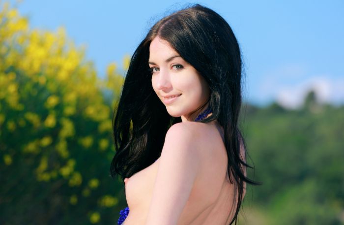 Отдыхая на природе и подставляя навстречу теплому ветерку свои прелести, голая брюнетка с красивой эротично позирует перед камерой и, нежно поглаживая себя в самых чувствительных местах.