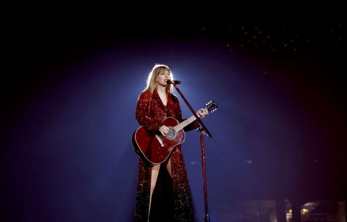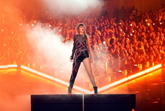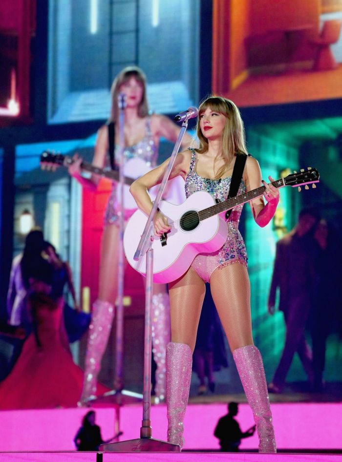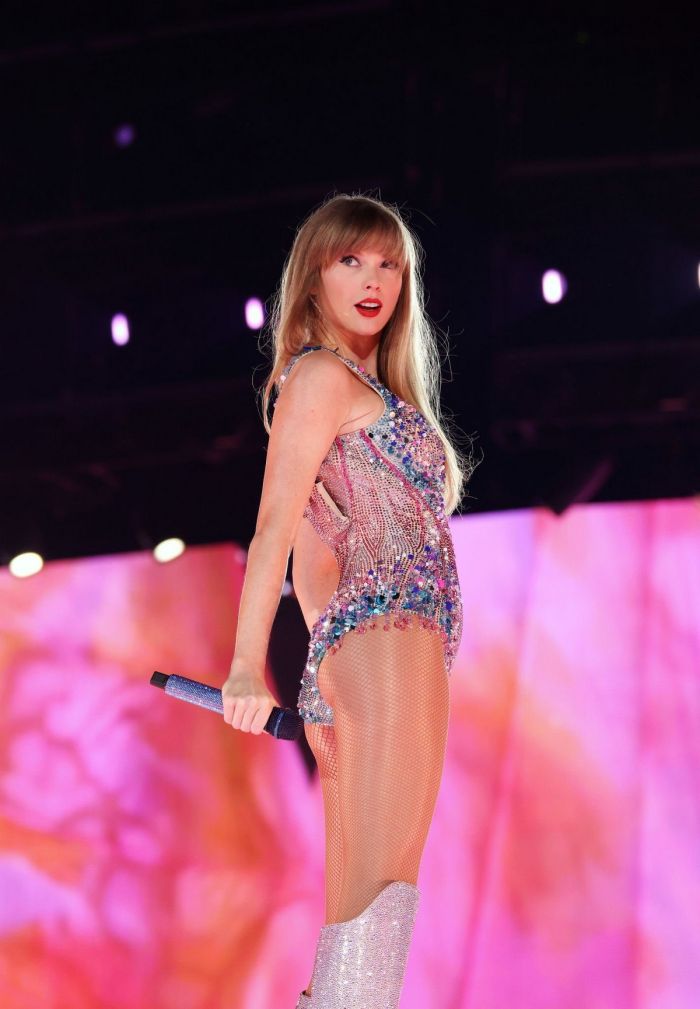 33-летняя американская певица, автор-исполнитель, музыкальный продюсер, режиссёр и актриса Тейлор Свифт (Taylor Swift) зажигает на сцене в сексуальных нарядах на Eras Tour в Глендейле.