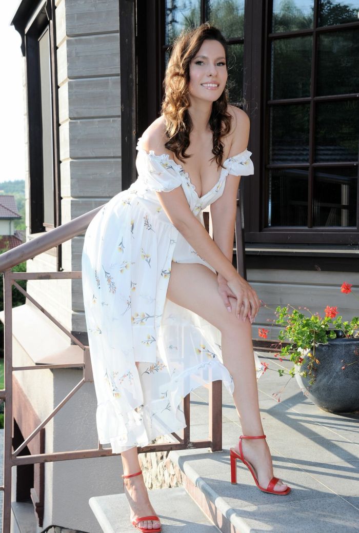 Эротично позируя перед камерой на свежем воздухе и вытащив из платья свои сочные упругие груди, эффектная красотка без нижнего белья расселась на лестнице с раздвинутыми ногами и во всей красе показала свои прелести.