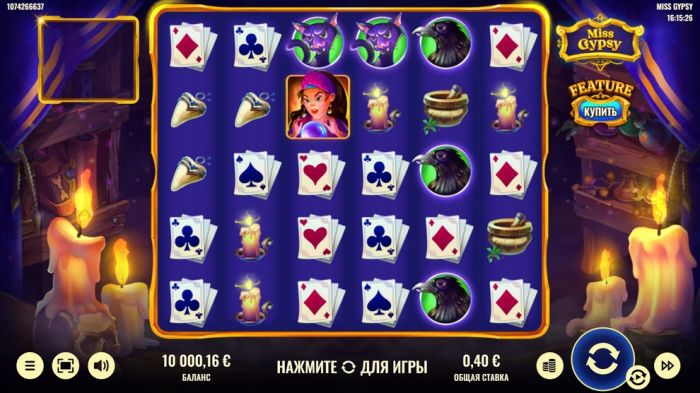 Игра Цыганка (Miss Gypsy) представлена в казино на Айлав-казино. В каталогах вы сможете найти лучшие аппараты известных провайдеров, включая и данный слот. Начинать знакомство с игрой лучше всего с бесплатного демонстрационного режима. Разобравшись с правилами и выбрав оптимальную стратегию, можно переходить к реальным бетам. Первые средства на балансе для ставок можно будет получить из бездепозитного бонуса, а полученные выигрыши выводить на карты банков, электронные кошельки и даже в криптовалютах.