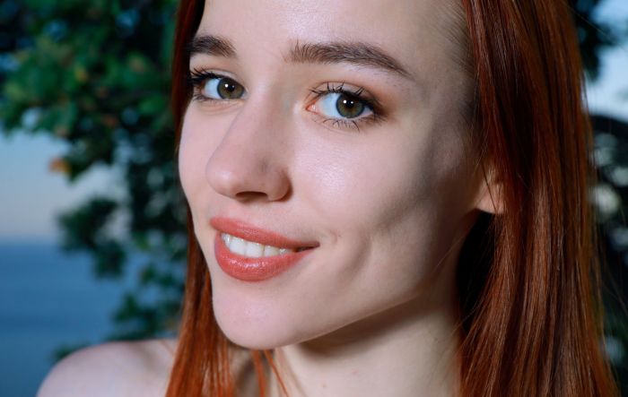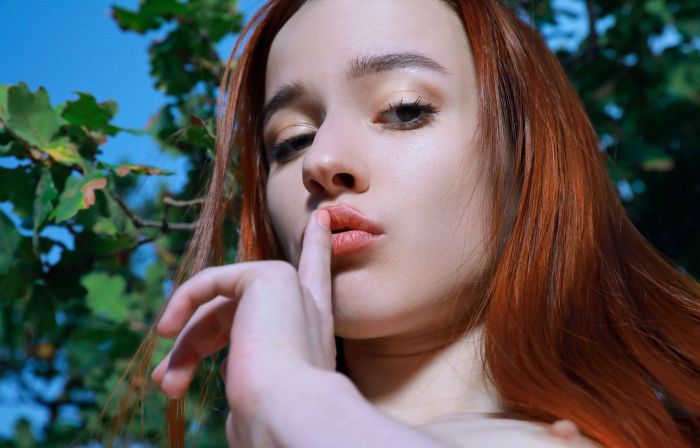 Дерзко и страстно сорвав с себя всю одежду, рыжая девушка открыто показала на камеру свои сексуальные титьки с острыми сосками и принялась без остановки двигаться на фоне природы в разных эротических позах.