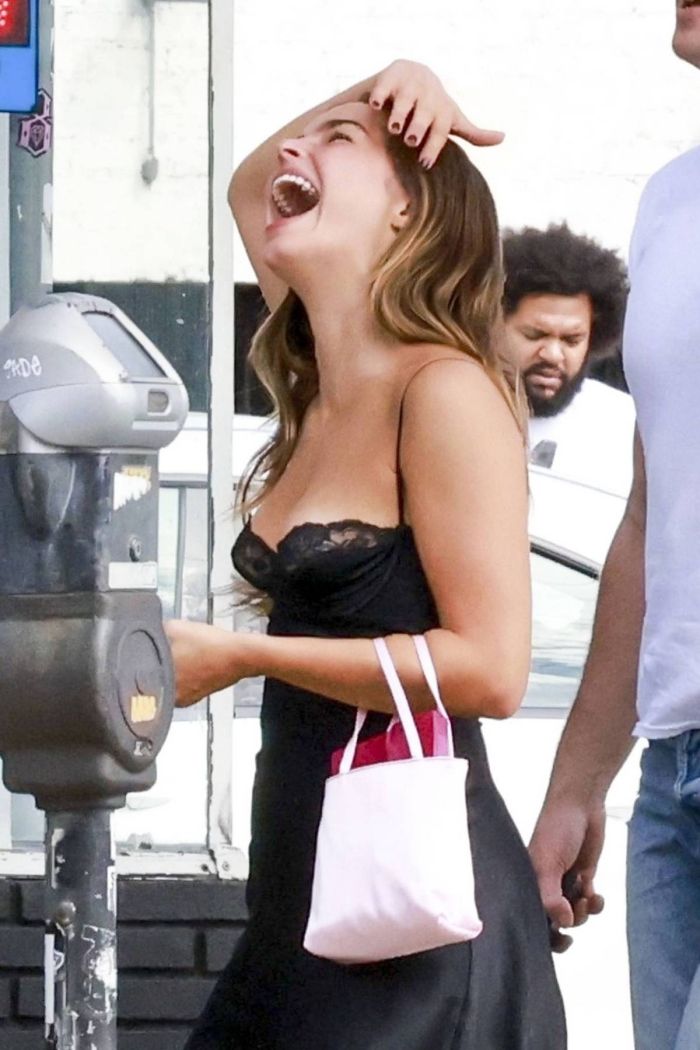 22-летняя американская певица, танцовщица и актриса Эддисон Рэй (Addison Rae) в коротеньком черном платье на прогулке.