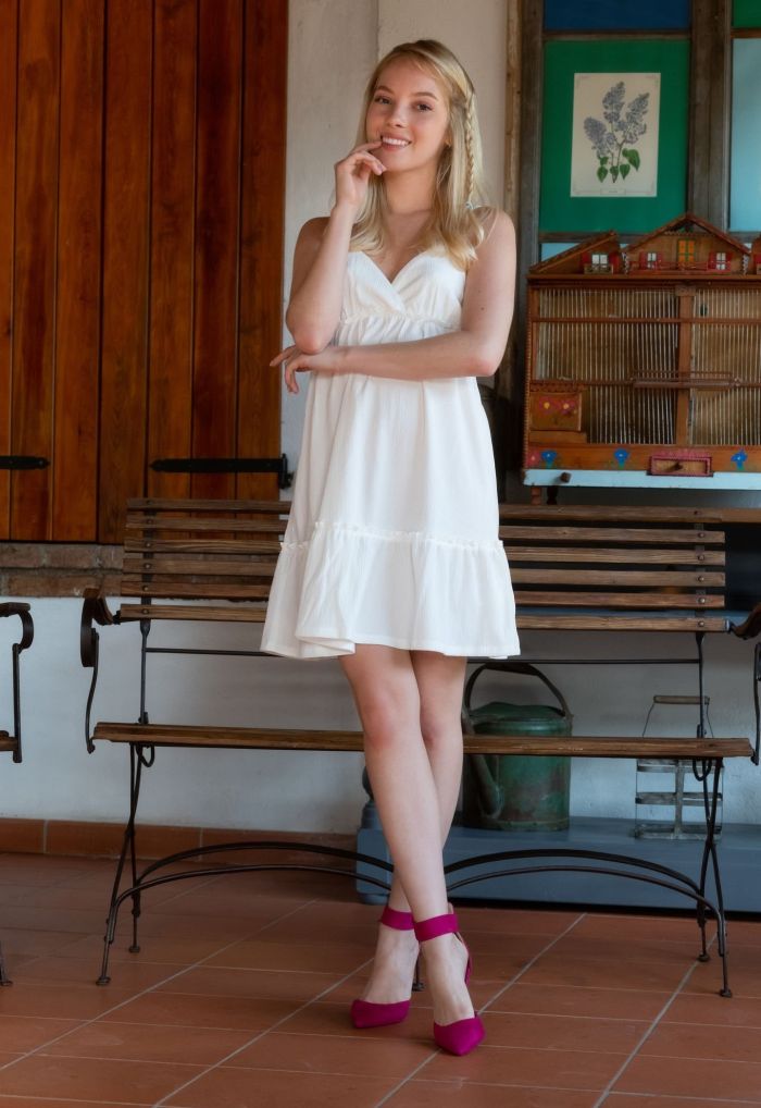 Эротично оголив свое молодое тело с нежными грудями, голая девушка решила показать нам свои прелести и без всякого стеснения. Немного повиляв своей упругой попкой, развратная красотка развалилась на скамейке с высоко поднятыми ногами …