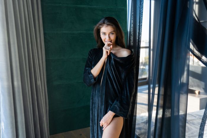 Эротично позируя перед камерой в шикарной спальне и постепенно снимая с себя халат, обнаженная красотка с красивым сексуальным телом показала крупным планом все свои заветные места.