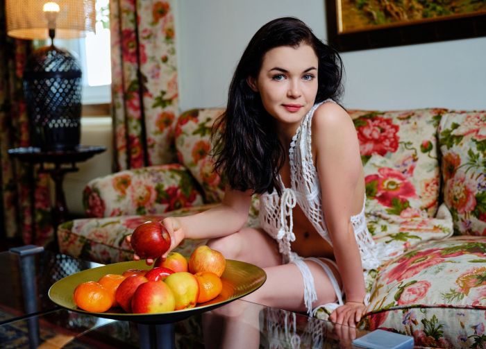 Соблазнительно медленно избавив свое стройное тело от просвечивающего откровенного наряда, голая девушка бесстыже разлеглась перед нами на диване с широко раскинутыми ногами и крупным планом предлагает нам полюбоваться ее самыми интимными сладкими местечками.