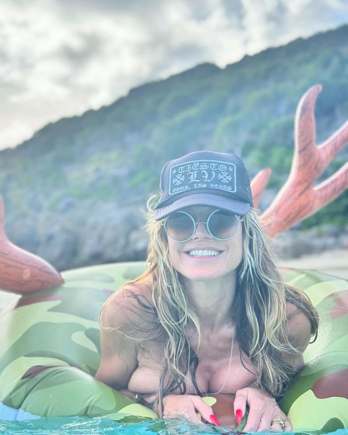 50-летняя немецкая супермодель, актриса и телеведущая Хайди Клум (Heidi Klum) топлес на пляже во время отдыха.
