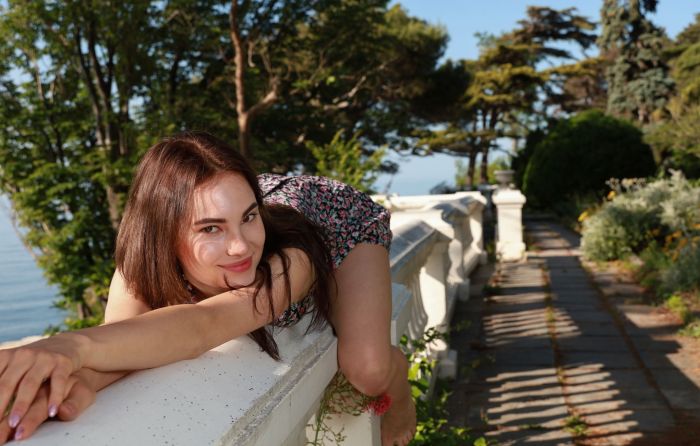 С удовольствием начав позировать среди пышной зелени, развратная красотка без трусиков игриво снимает свое короткое платье в парке и с удовольствием демонстрирует свои голые прелести.