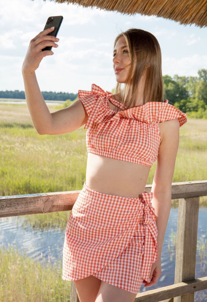 Свободно чувствуя себя на свежем воздухе и вытворяя разные неприличные вещи, симпатичная девушка в топе и юбке с удовольствием показала под всем эти свое стройное тело и, развратно раздвигая аппетитные ножки.
