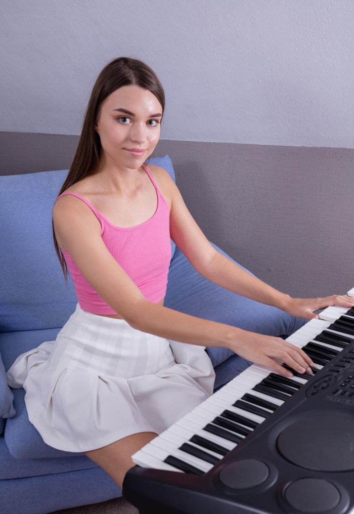 Резво стянув с себя короткую юбку и майку, стройная красавица с красивой грудью соблазнительно выпячивала в разных позах нежную попочку и, кокетливо раскрывая нежные бёдра, бесстыже показала нам свои прелести.