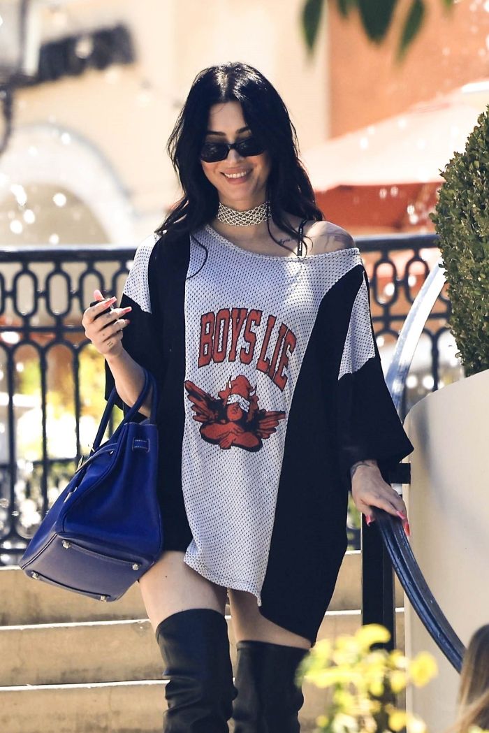 38-летняя американская актриса и фотомодель Меган Фокс в короткой футболке и ботфортах отправилась за покупками . Знойная звезда попала в заголовки газет со своим смелым нарядом, очаровав как зрителей, так и фанатов.