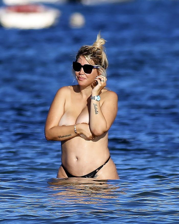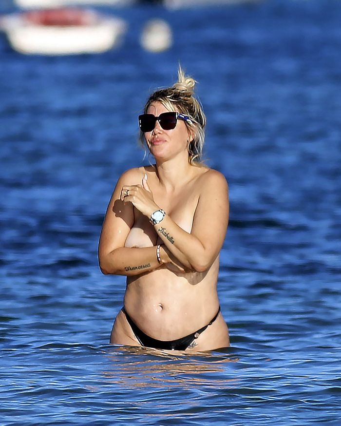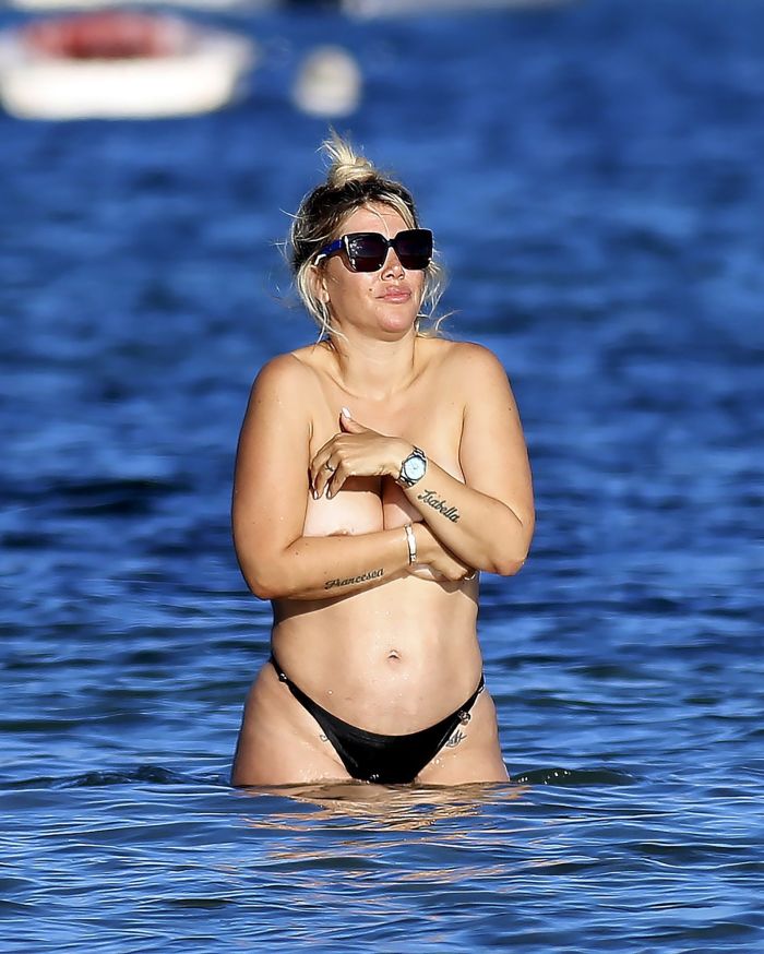 37-летняя аргентинская модель, танцовщица, телеведущая и футбольный агент Ванда Нара была поймана папарацци во время дерзкой демонстрации на пляже на Ибице, едва прикрывая свою большую грудь только руками.
