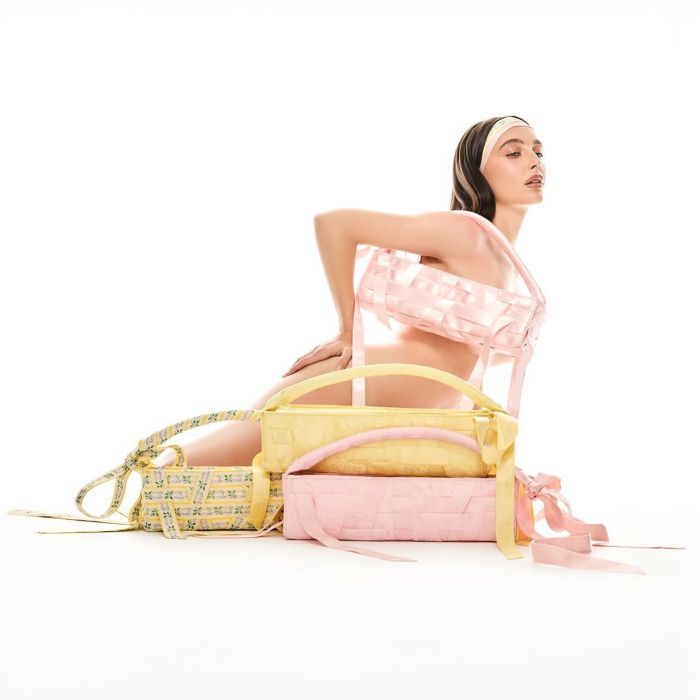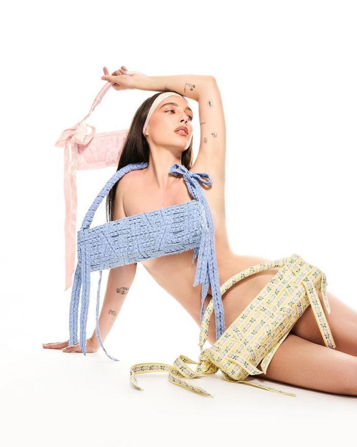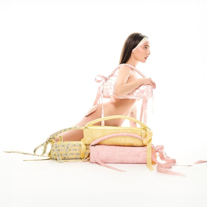 23-летняя американская блогерша, ведущая и звезда социальных сетей Эмма Чемберлейн (Emma Chamberlain) в откровенной фотосессии позирует в обнаженном виде, прикрывая интимные места сумочками.