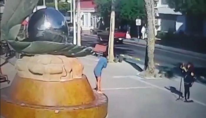 Она позировала на фоне скульптуры, пока движение по двухполосной дороге рядом с набережной замедлялось, а прохожие в шоке наблюдали за происходящим.