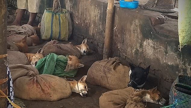 В Индии употребление собак в пищу незаконно, но в сельских районах на северо-востоке страны по-прежнему едят собачатину. На снимках, сделанных на рынке города Димапур, запечатлен ходовой товар - связанные псы в мешках. По приблизительным оценкам, в штате Нагаленд и близлежащих штатах ежегодно убивают около 30 000 собак.