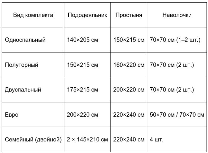 Важно подбирать белье в соответствии с размерами матраса, подушек и одеяла. В России и странах СНГ применяются следующие стандарты: