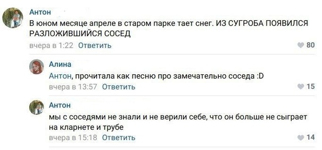 Смешные комментарии из социальных сетей, часть 123-лучшее Запостил: Viking,3-04-2020, 00:00вЮмор / Свежее Свежие и веселые, до слёз смешные и позитивные скриншоты с комментариями из социальных сетей!Предыдущая часть ТУТ Смешные комментарии, комментарии из социальных сетей, юмор, лучшее, часть 123 Нравится 27 Не нравится 1 Комментарии (0) Добавить комментарий Прокомментировать Введите два слова с картинки: Отправить