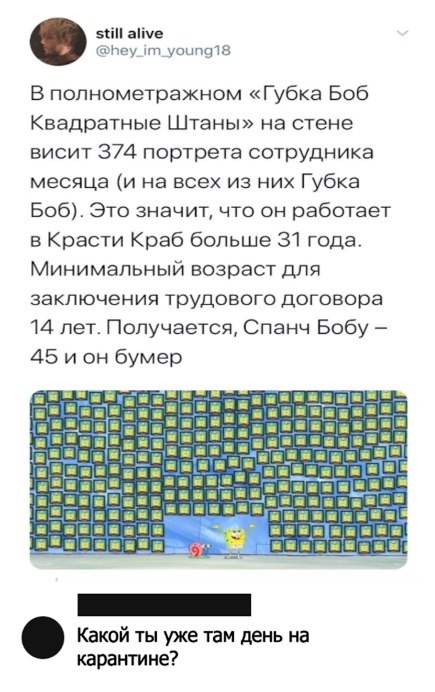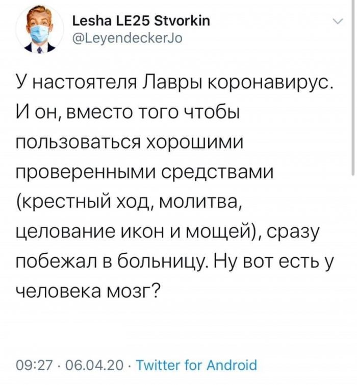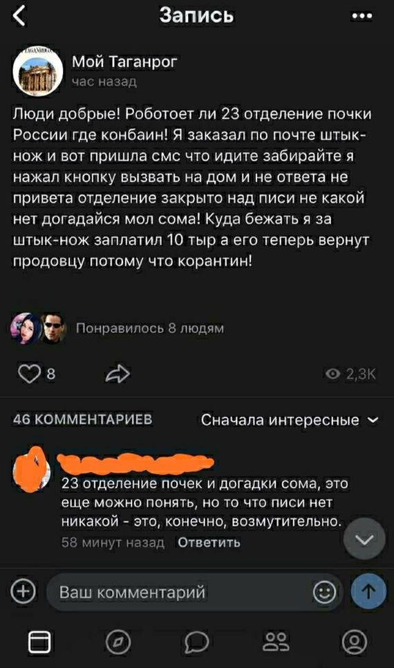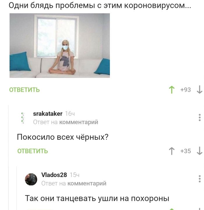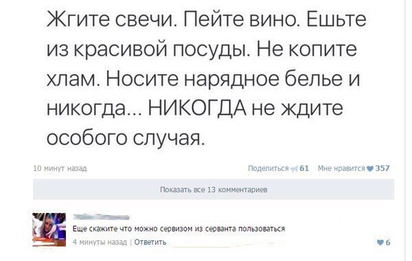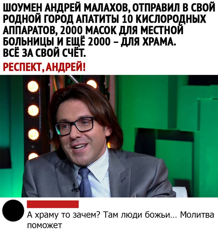 Смешные комментарии из социальных сетей, часть 125-лучшее Запостил: Viking,8-04-2020, 00:00вЮмор / Золото Свежие и веселые, до слёз смешные и позитивные скриншоты с комментариями из социальных сетей!Предыдущая часть ТУТ Смешные комментарии, комментарии из социальных сетей, лучшее, юмор, часть 125 Нравится 30 Не нравится 4 Комментарии (1) Добавить комментарий Прокомментировать Введите два слова с картинки: Отправить #1 Нашальника Посетитель 8 апреля 2020 19:54 -1 Достали с политотой. Лукашенко где-то чего-то предложил по 50 грамм перед сном. Нахера эта дырявая пропаганда выпивки. И что за такое в президенты выбирать. Хорош балдеть . Если автор действительно так думает и это продвигает , то это дно. Ниже некуда. Ответить