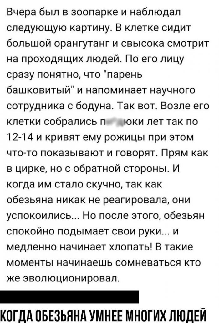 Смешные комментарии из социальных сетей, часть 135-лучшее Запостил: Viking,1-05-2020, 00:00вЮмор / Золото Свежие и веселые, до слёз смешные и позитивные скриншоты с комментариями из социальных сетей!Предыдущая часть ТУТ Смешные комментарии, комментарии, комментарии из социальных, лучшее, юмор, часть 135 Нравится 26 Не нравится 8 Комментарии (1) Добавить комментарий Прокомментировать Введите два слова с картинки: Отправить #1 Нашальника Посетитель 1 мая 2020 18:40 -3 А что про навального постик не ломанул? Гляжу тебе эти обезьяны -родственные души. Ответить