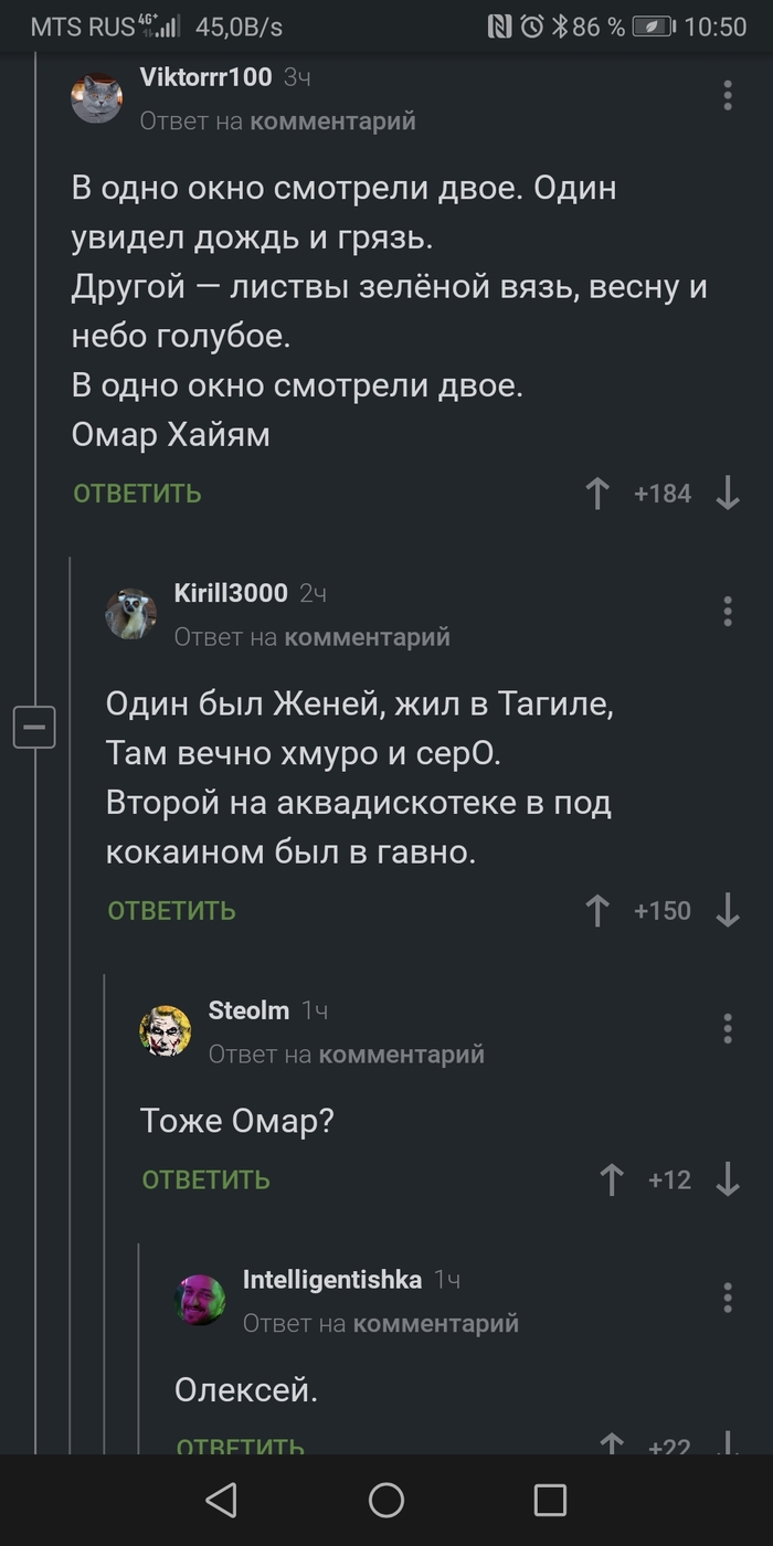 Смешные и познавательные комментарии из сети Запостил: Viking,25-01-2021, 00:00вЮмор / Золото Чтобы отвлечь Вас насущных дел хотим развлечь Вас очередной подборкой в которой Вы найдете прикольные, познавательные и в тоже время смешные комментарии. Данная подборка с легкостью поднимет Вам настроения. Предыдущая часть ТУТ Нравится 48 Не нравится 3 Комментарии (0) Добавить комментарий Прокомментировать Введите два слова с картинки: Отправить