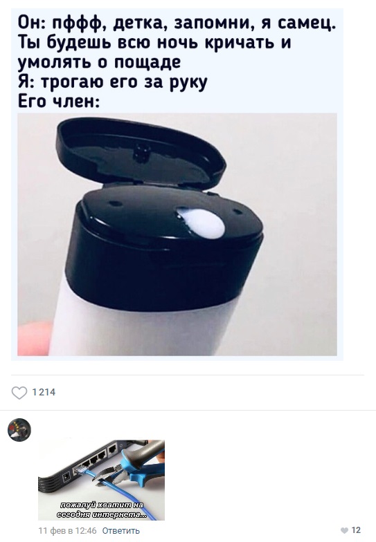 Пошлое в комментариях и картинках Запостил: Viking,14-02-2021, 00:00вЮмор / Золото Смешные но в тоже время пошлые комментарии для поднятия Вашего настроения с просторов социальных сетей. Тонким натурам, детям и людям которые не любят юмор с перчинкой, смотреть не рекомендуется.Предыдущая часть ТУТ Нравится 39 Не нравится 5 Комментарии (0) Добавить комментарий Прокомментировать Введите два слова с картинки: Отправить