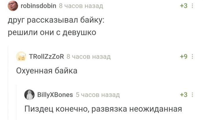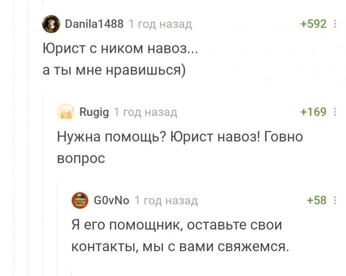 Смешные комментарии, которые заставят Вас улыбнуться Запостил: Viking,15-03-2021, 00:00вЮмор / Золото Что заставляет вас улыбаться? Мы нашли ответ на этот вопрос - это подборка в которой собраны лучшие комментарии к картинкам и фотографиям. Мы работаем для того, чтобы у Вас было хорошее настроение!Предыдущая часть ТУТ Нравится 34 Не нравится 9 Комментарии (0) Добавить комментарий Прокомментировать Введите два слова с картинки: Отправить