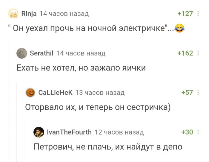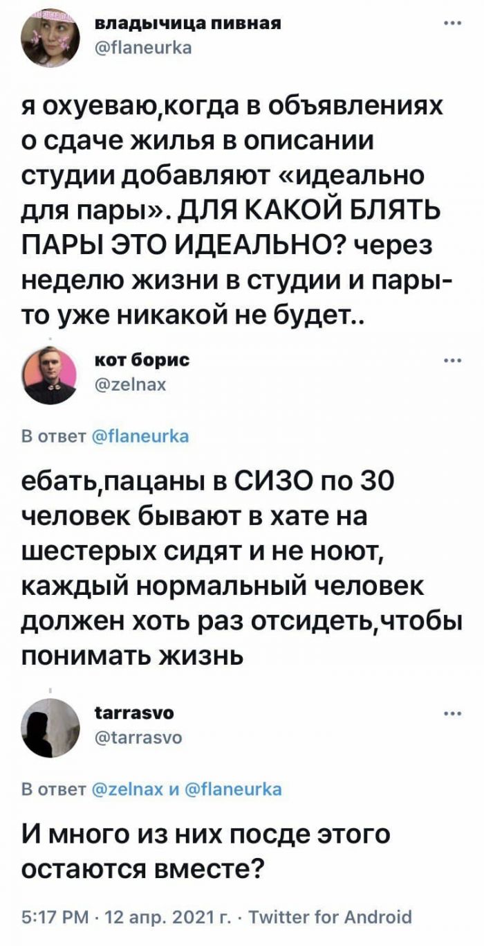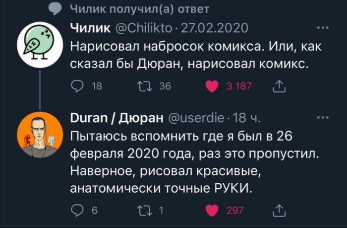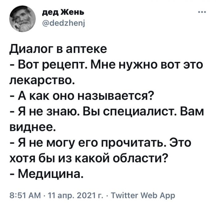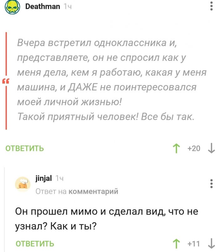 Лучшие комментарии, смс переписки и мемы из социальных сетей Запостил: Viking,14-04-2021, 00:00вЮмор / Золото Топ лучших комментариев и смс переписки из социальных сетей и других частей интернета. Мы собрали лучшее что есть в сети, чтобы Ваше настроение было на высоте с утра пораньше!)Предыдущая часть ТУТ Нравится 37 Не нравится 4 Комментарии (0) Добавить комментарий Прокомментировать Введите два слова с картинки: Отправить