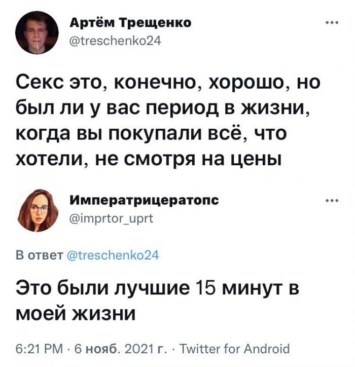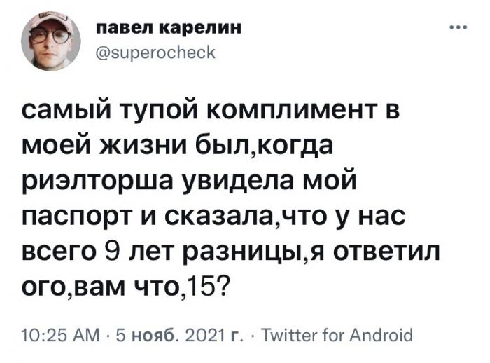Остроумные комментарии и СМС-переписки Запостил: Viking,8-11-2021, 00:00вЮмор / Золото Встречайте свежую порцию прикольных комментариев из социальных сетей и смешные смс переписки. Не поленитесь посмотрите нашу новую подборку и хорошие настроение вам гарантировано.Предыдущая часть ТУТ Нравится 41 Не нравится 7 Комментарии (1) Добавить комментарий Прокомментировать Введите два слова с картинки: Отправить #1 Eddy92 Местный 8 ноября 2021 11:44 +1 Последний комментатор побоялся бы такое писать. Любит человек девушку по настоящему и что такого? Нормально выглядит - настоящая Ответить