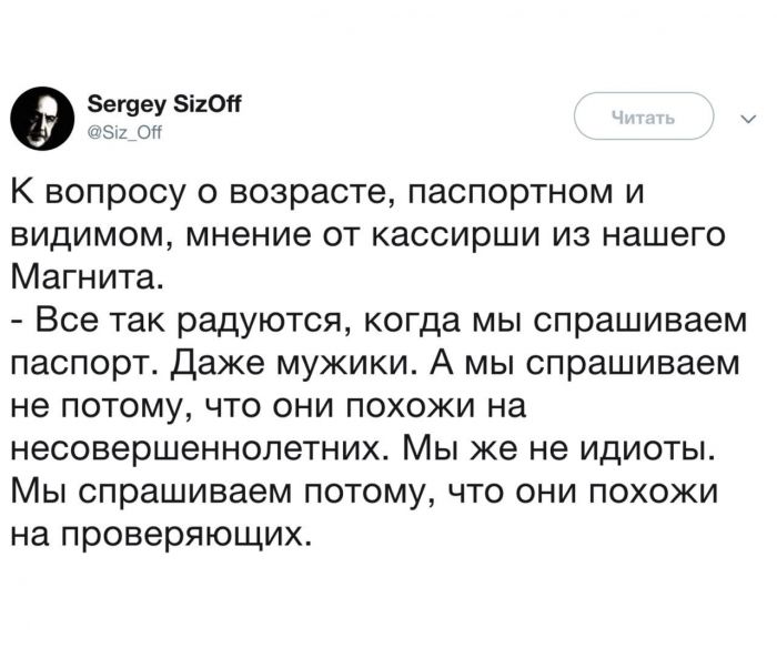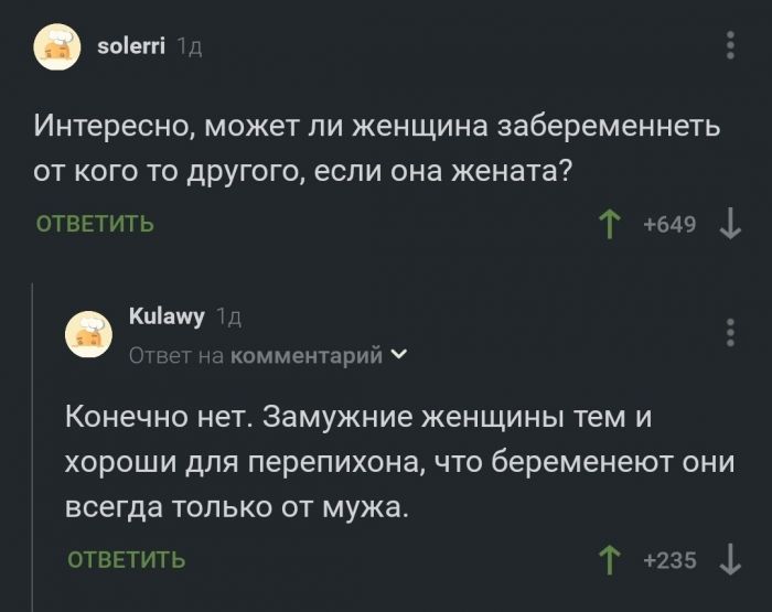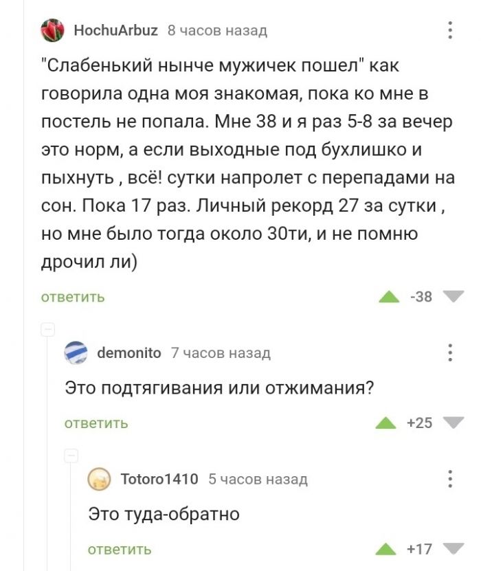 Прикольные картинки и смешные комментарии Запостил: Viking,21-08-2022, 00:00вЮмор / Золото Cмешные комментарии и картинки с надписями из соцсетей. Свежие смешные переписки и комментарии в соцсетях, а так же отборные мемы для отличного настроения! Предыдущая часть ТУТ Нравится 45 Не нравится 9 Комментарии (1) Добавить комментарий Прокомментировать Введите два слова с картинки: Отправить #1 Storm Шутник 21 августа 2022 15:34 -1 Как же женатая женщина забеременеет от жены???Это всё херня по сравнению с Ответить