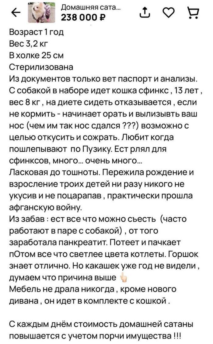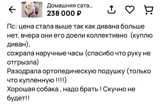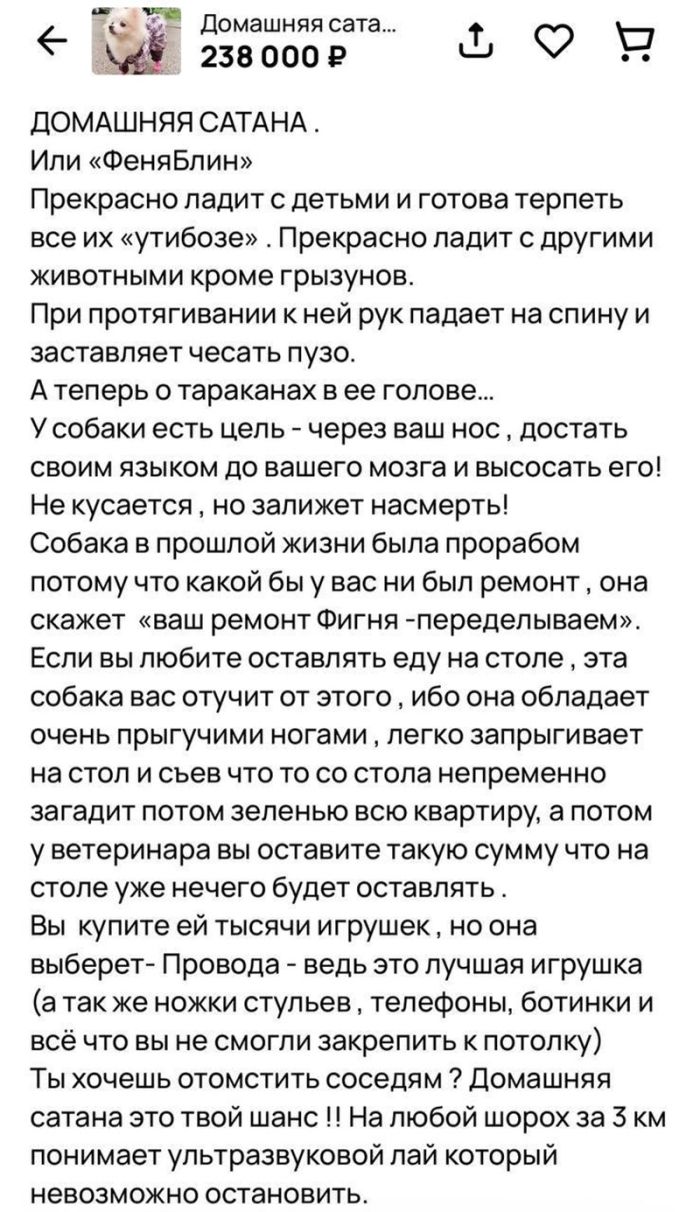 Задумываетесь прикупить себе собачку, или супруга с детками поднадоели просьбами о миленьком четвероногом питомце? Вот вам прелюбопытное объявление о продаже очаровательного шпица, который превратил жизнь своего хозяина в настоящий ад праздник.