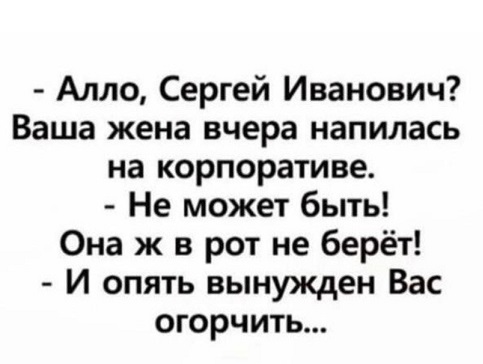 Смешные мемы и прикольные картинки на выходные Запостил: Viking,27-01-2024, 00:00вЮмор / Золото Одна из лучших подборок новых мемов и смешных картинок с надписями, для вашего хорошего настроения в эти выходные дни! картинки с надписями, подборка приколов Нравится 59 Не нравится 17 Комментарии (1) Добавить комментарий Прокомментировать Введите два слова с картинки: Отправить #1 Дядя Жора Местный 27 января 2024 08:36 -3 хрень Ответить